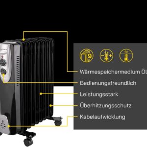 Das Gerät nutzt Öl als Wärmespeichermedium, welches sich nach dem Einschalten zügig erhitzt. Das Öl speichert die Energie besonders lange und gibt die Wärme anschließend gleichmäßig an den Raum ab, was für ein angenehmes Raumklima sorgt. Mit seinen 3 Heizstufen und 9 Rippen bietet er dabei eine effektive Wärmeleistung für verschiedene Bedürfnisse.