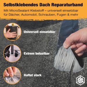 Dank der MicroSeal-Technologie ist das HSS Dach Reparaturband vielseitig einsetzbar, um verschiedene Leckagen oder Schadstellen schnell zu versiegeln. Da es sich um ein hochwertiges, selbstklebendes Material handelt, kann es auf den meisten gängigen Dachmaterialien zur temporären oder dauerhaften Reparatur verwendet werden.