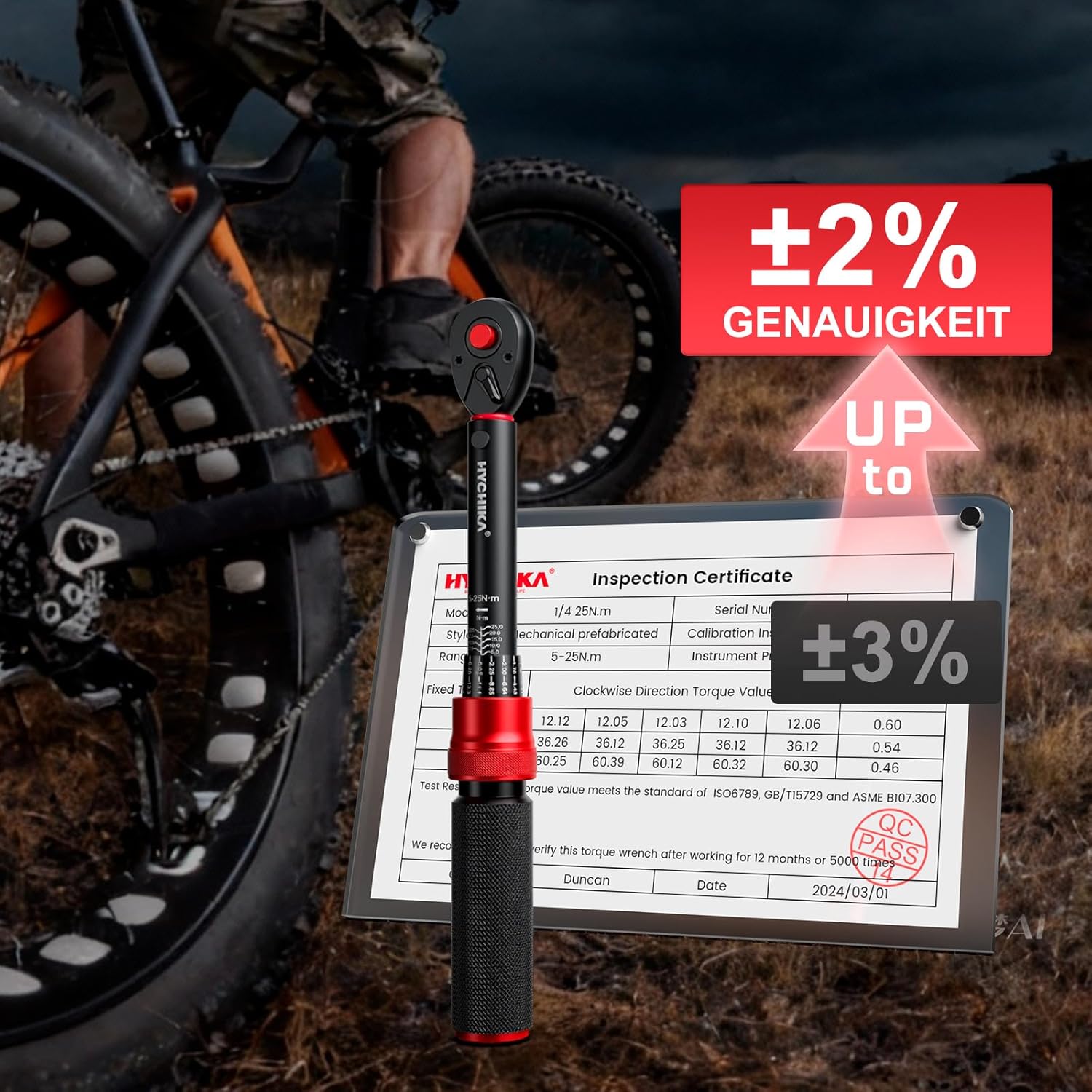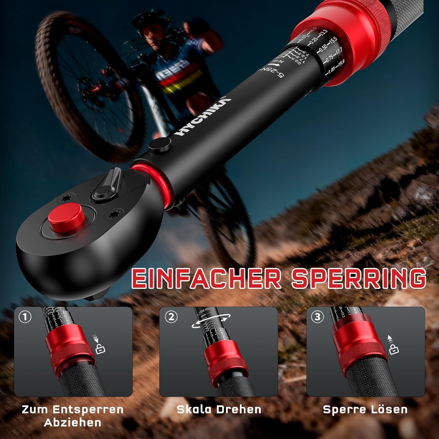 Der HYCHIKA 13-teilige 1/4″ Drehmomentschlüssel ist das ideale Werkzeug für ambitionierte Fahrradschrauber und Mechaniker, die bei feinen Verschraubungen kein Risiko eingehen wollen. Mit seinem präzisen Drehmomentbereich von 5-25 Nm stellst du sicher, dass empfindliche Bauteile aus Carbon oder Aluminium exakt nach Vorgabe angezogen werden. Dieses Set richtet sich an alle, die in der heimischen Werkstatt oder unterwegs Wert auf professionelle Ergebnisse legen.