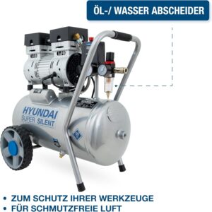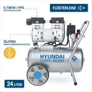 HYUNDAI Silent Kompressor SAC55752 | 24L Kessel, 8bar, ölfrei | 0.75kW / 1.0PS | Ansaugleistung 125 L/Min | Öl-Wasserabscheider | 59dB Luftkompressor leise, Flüster-Kompressor –