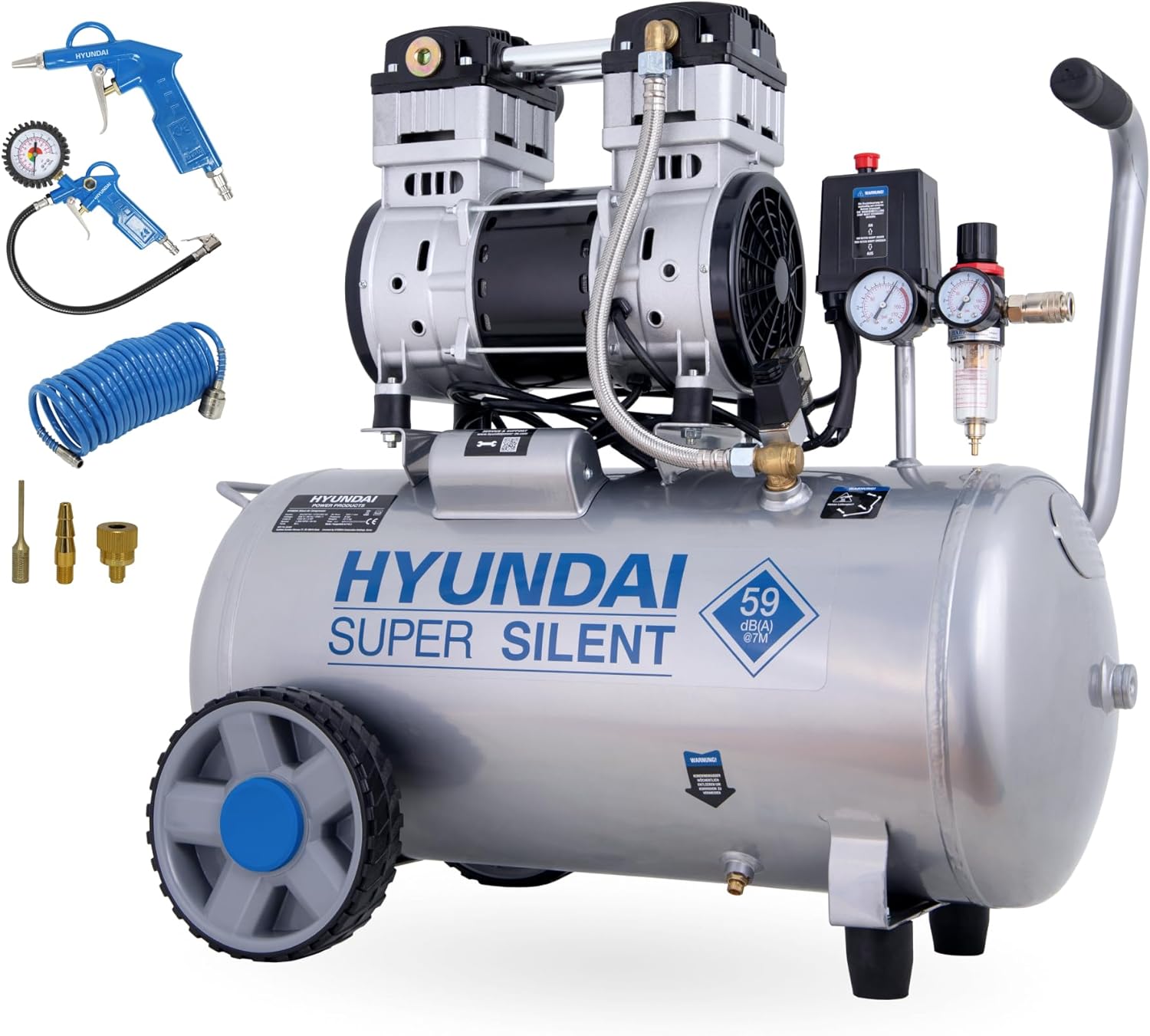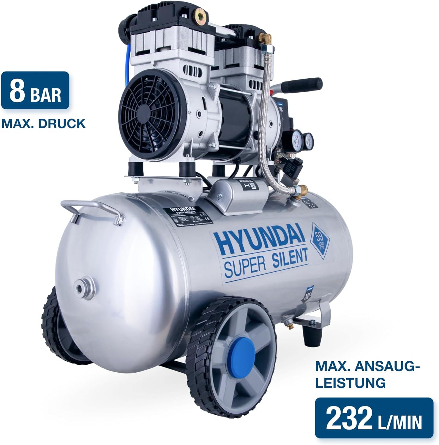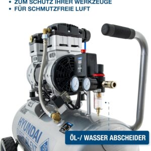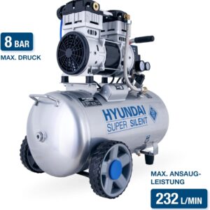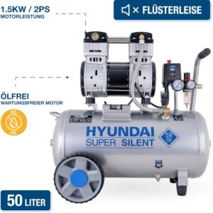 Der HYUNDAI Silent-Kompressor zeichnet sich durch einen extrem leisen Betrieb aus. Dank seiner geräuscharmen Bauweise ist er ideal für den Einsatz in geschlossenen Räumen wie Laboren, Werkstätten oder dem heimischen Bereich geeignet.