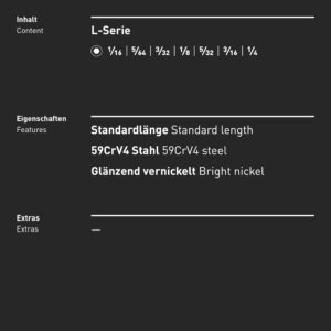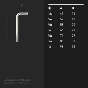 Das Set deckt die gängigsten Zoll-Maße ab, die man braucht, sobald man an importierten Maschinen oder Fahrrädern mit US-Standard schraubt. Konkret sind das sieben Größen: 1/16″, 5/64″, 3/32″, 1/8″, 5/32″, 3/16″ und 1/4″. Damit ist man für die allermeisten Einsätze im amerikanischen Standard bestens gerüstet.