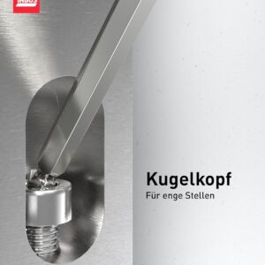 Aus unserer Erfahrung in der Werkstatt ist vor allem der Übergangsbereich vom Griff zum Kugelkopf entscheidend. Hier zeigt sich die hohe Fertigungspräzision: Der Kugelkopf ist so kalibriert, dass er die Schraube sicher führt, ohne dabei Spiel zu entwickeln, das zum Ausleiern des Innensechskants führen könnte. Bei beengten Platzverhältnissen, wie man sie beispielsweise beim Einstellen von Bremszangen oder beim Lösen von Gehäuseschrauben an Motoren findet, spielt der 30-Grad-Schwenkbereich seine volle Stärke aus.