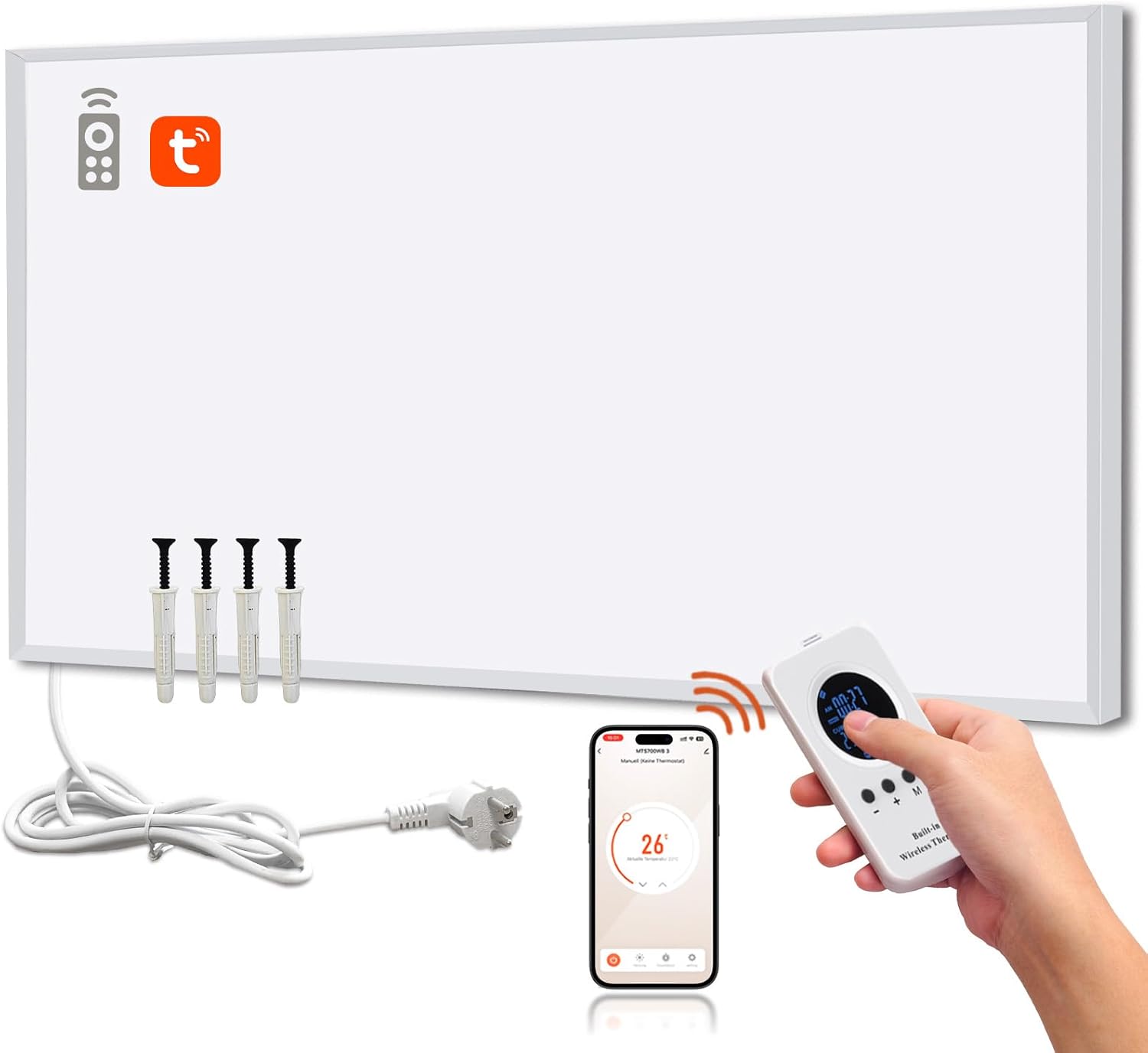 - Smarte Kontrolle: Vollständige Integration via TuYa-App und inkludierter Fernbedienung für präzise Steuerung der Heizintervalle.