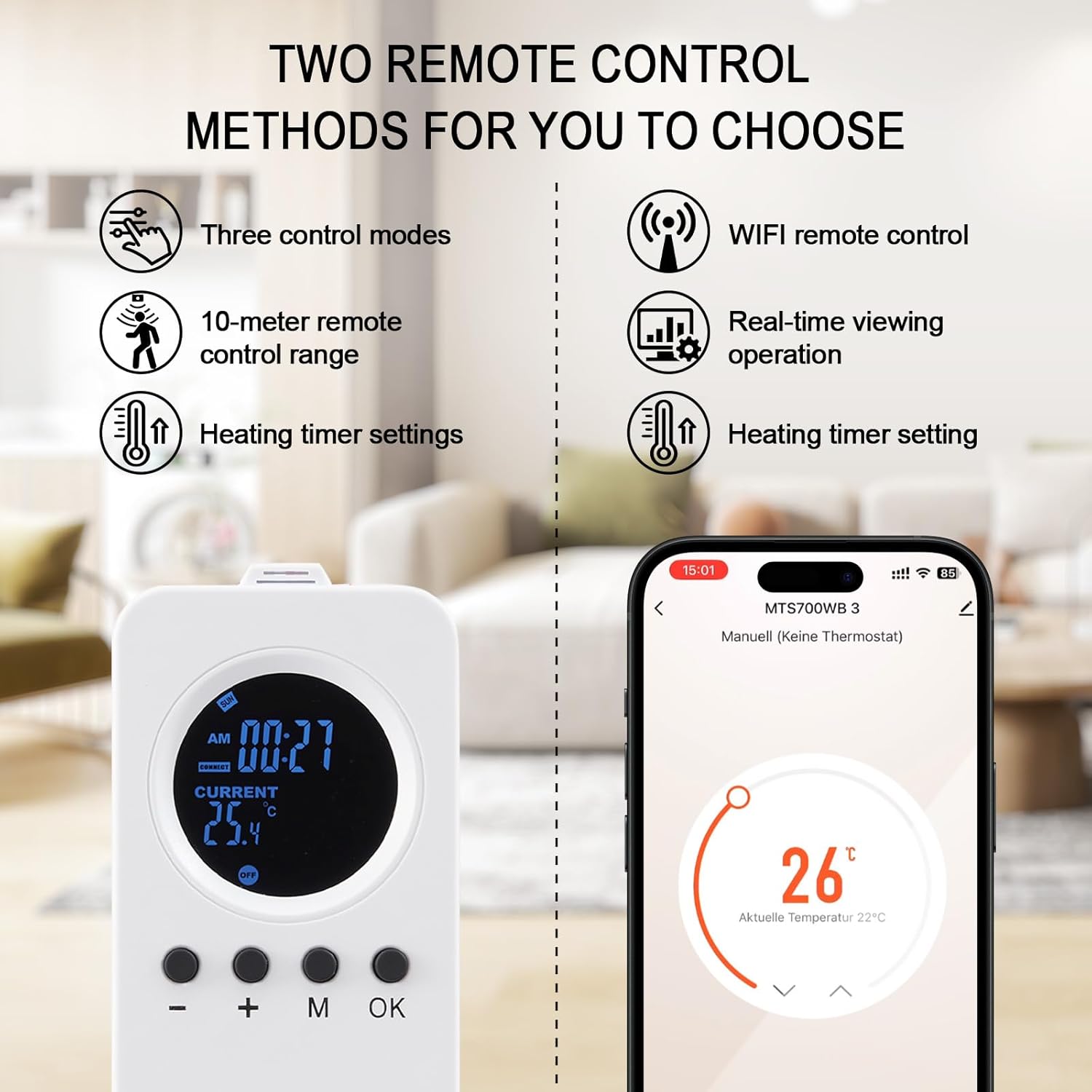 Die WLAN-Steuerung erfolgt bequem über die TuYa-App auf Ihrem Smartphone. Zudem ermöglicht die mitgelieferte Fernbedienung eine intelligente Temperaturregelung mit drei verschiedenen Modi.