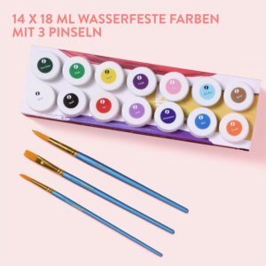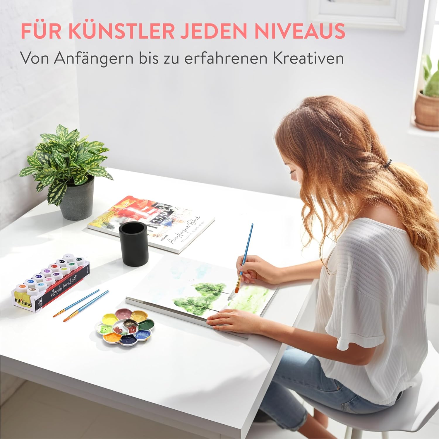 Das Set von int!rend umfasst 14 hochwertig hergestellte, wasserfeste Acrylfarben. Sie ermöglichen durch ihre Textur fließende Übergänge, individuelle Schattierungen sowie perfekte Farbverläufe, damit Ihre Kunstwerke besonders gut zur Geltung kommen.