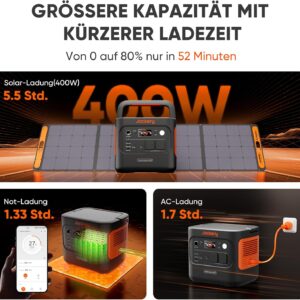 Die Explorer 2000 v2 bietet eine beeindruckend schnelle Ladezeit: Über die AC-Ladung ist der Akku in nur 1,7 Stunden vollständig geladen, wobei bereits nach 52 Minuten 80 % Kapazität erreicht werden. Alternativ kann die Powerstation mit einem 400W-Solarpanel in 5,5 Stunden vollständig mit Energie versorgt werden.