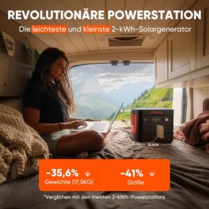 Sie ist die kompakteste 2-kWh-Powerstation ihrer Klasse und wiegt dank der innovativen CTB-Technologie nur 17,5 kg. Im Vergleich zu anderen Modellen dieser Leistungsklasse ist sie 41 % kleiner und 35,6 % leichter, was sie zusammen mit dem integrierten Tragegriff ideal für den mobilen Einsatz macht.