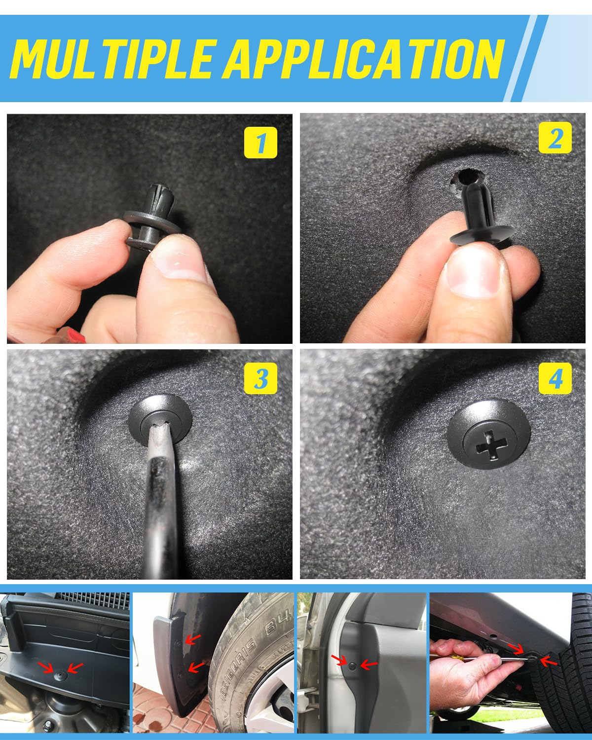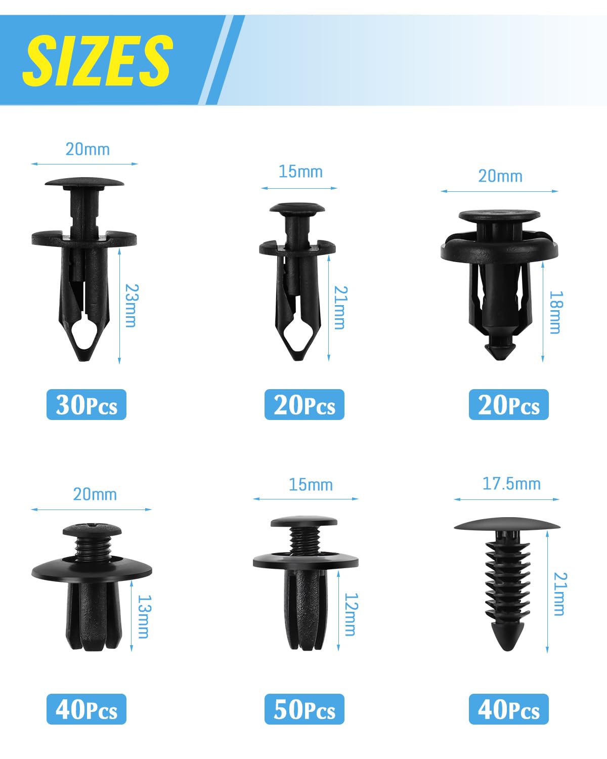 - Umfassendes Sortiment: Mit 200 Clips in 6 verschiedenen Größen hast du für jede typische Karosserie-Stelle sofort das passende Teil zur Hand.