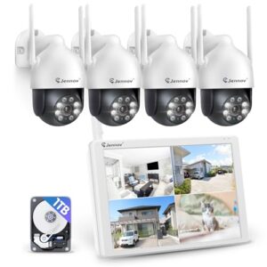 Jennov Überwachungskamera Set Aussen WLAN mit 10“Monitor 10CH Wireless NVR, 4 Pcs 5MP 360° PTZ WiFi Kameras mit 2 Wege Audio, Spotlight Alarm, Farbe Nachtsicht, Automatische Verfolgung, 1TB HDD