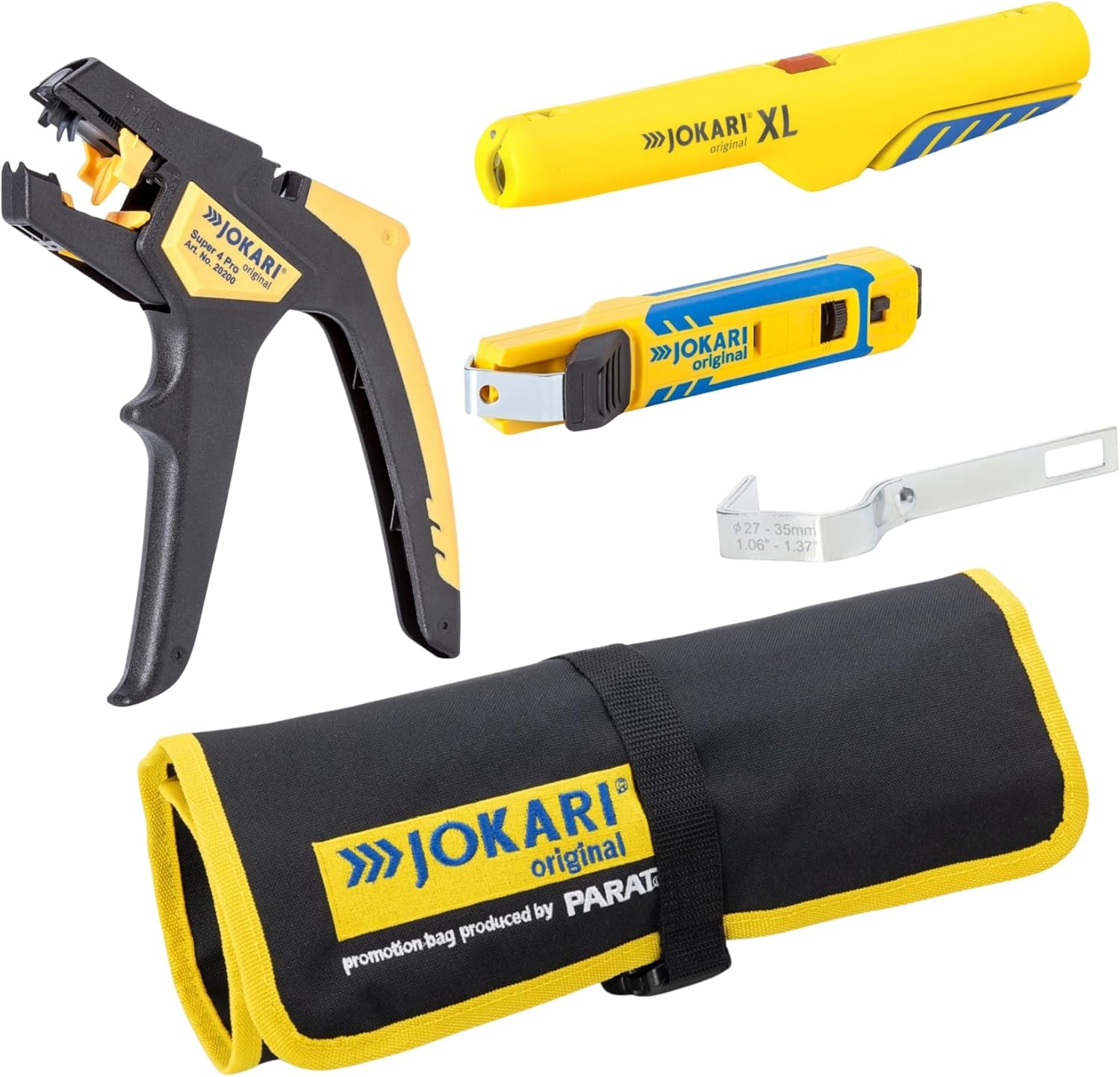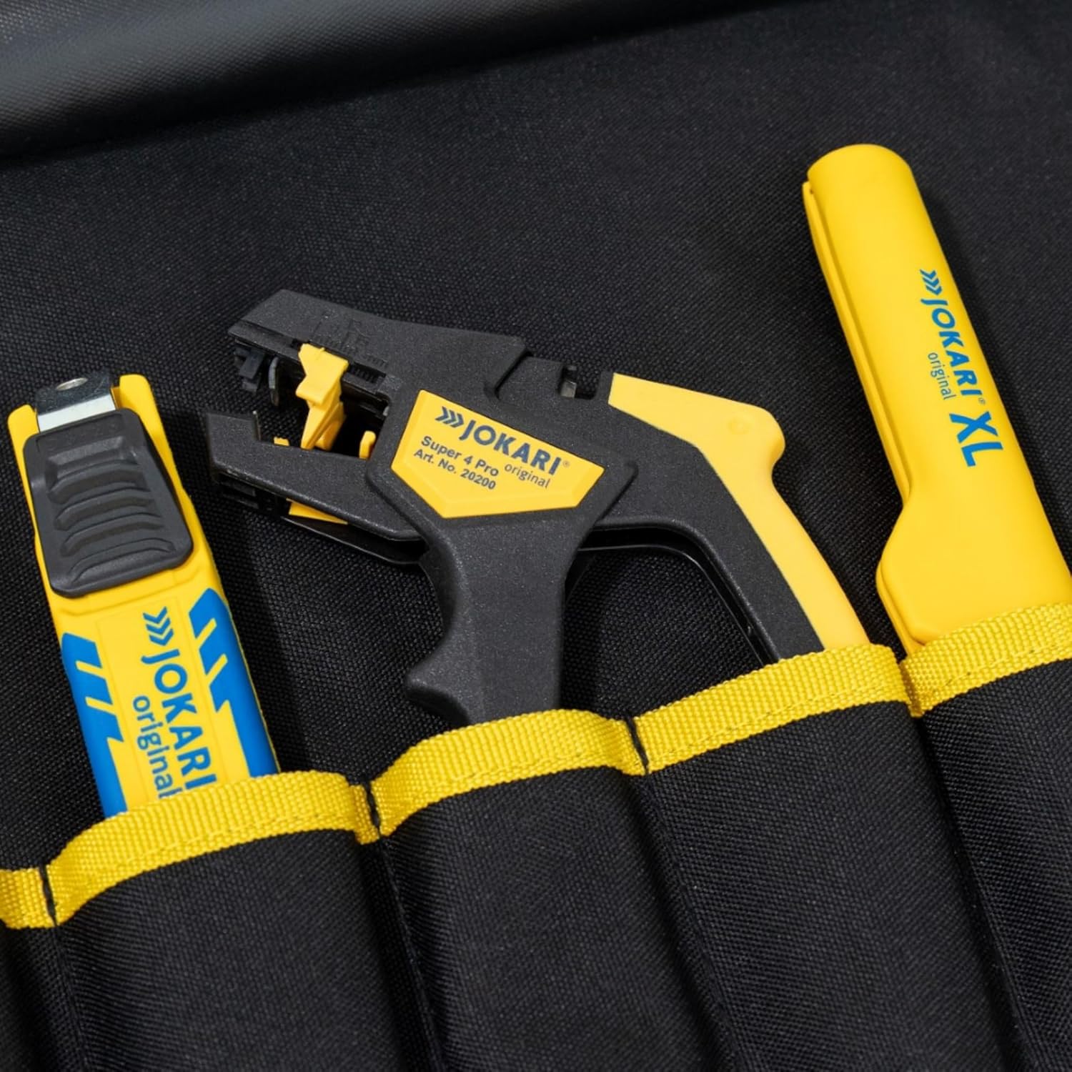 - Das praktische, 3-teilige Jokari Abisolier-Set inkl. Rolltasche beinhaltet die Jokari Abisolierzange Super 4 Pro, einen Jokari Kabelentmanteler XL, sowie das Kabelmessersystem 4-70