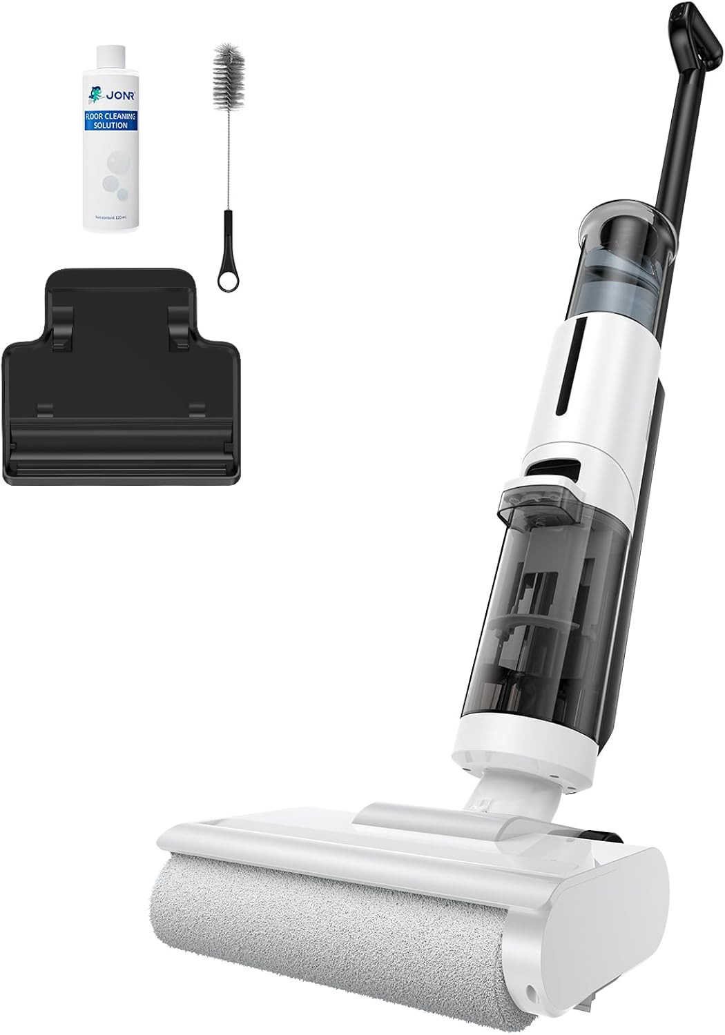Der JONR ED12 Lite vereint drei Arbeitsschritte in einem Gerät: Er saugt trockenen Schmutz und Haare auf, wischt gleichzeitig mit sauberem Wasser und trocknet die Oberfläche danach – ohne Wasserflecken oder Schlieren. Das Prinzip basiert auf einer rotierenden Bürstenrolle, die sowohl saugt als auch schrubbt, während das Zwei-Tank-System kontinuierlich frisches Wasser zuführt und Schmutzwasser getrennt auffängt.