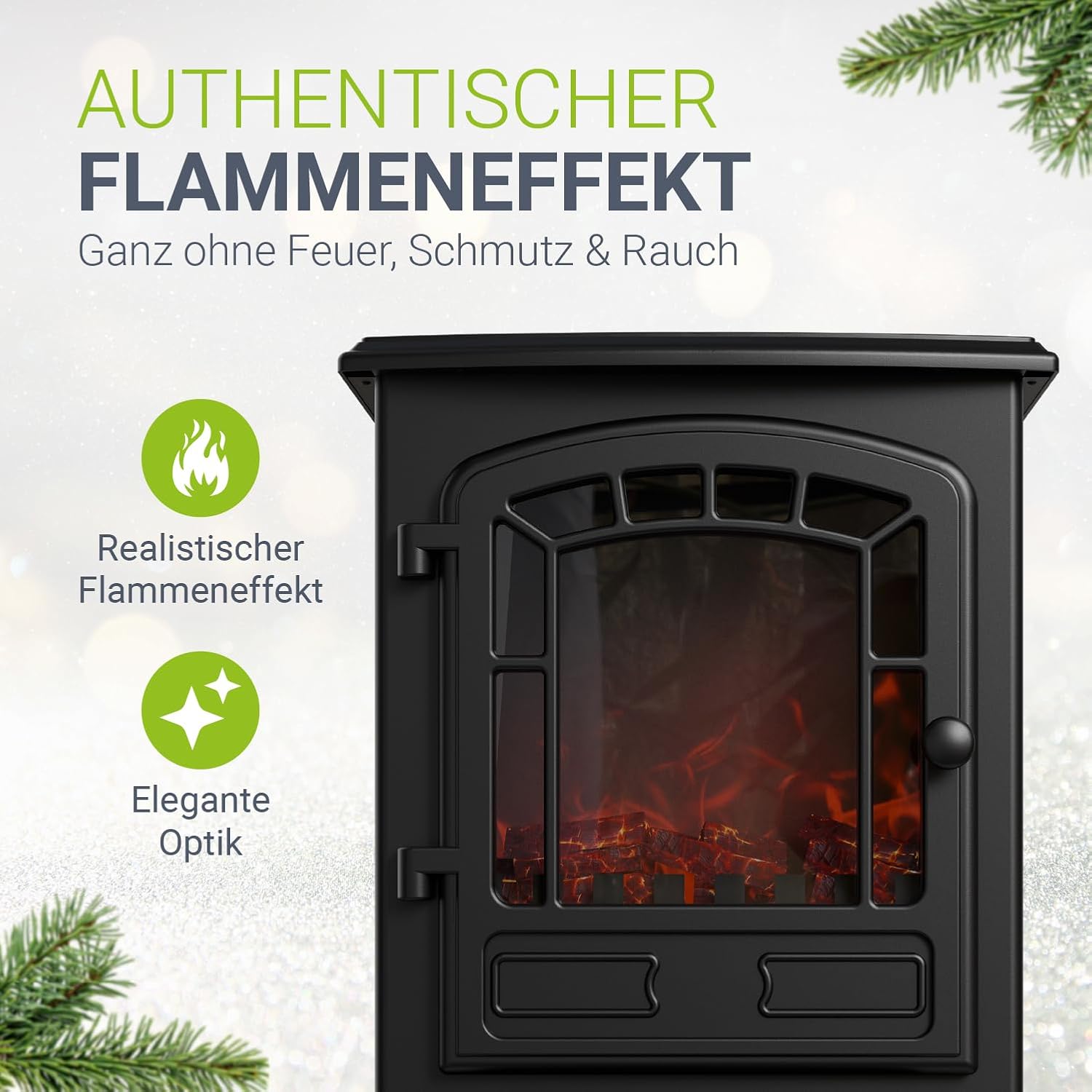 - • Simulierter Flammeneffekt: Sorgt für eine optische Aufwertung des Arbeitsplatzes, ohne dass Holz geschnitten oder Asche entsorgt werden muss.