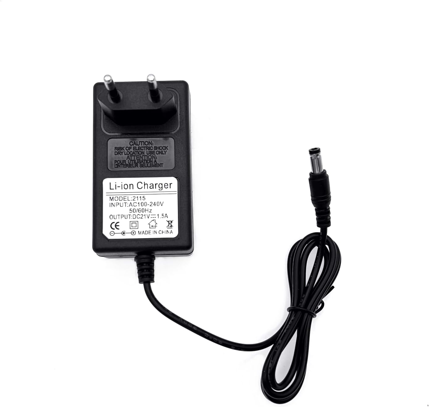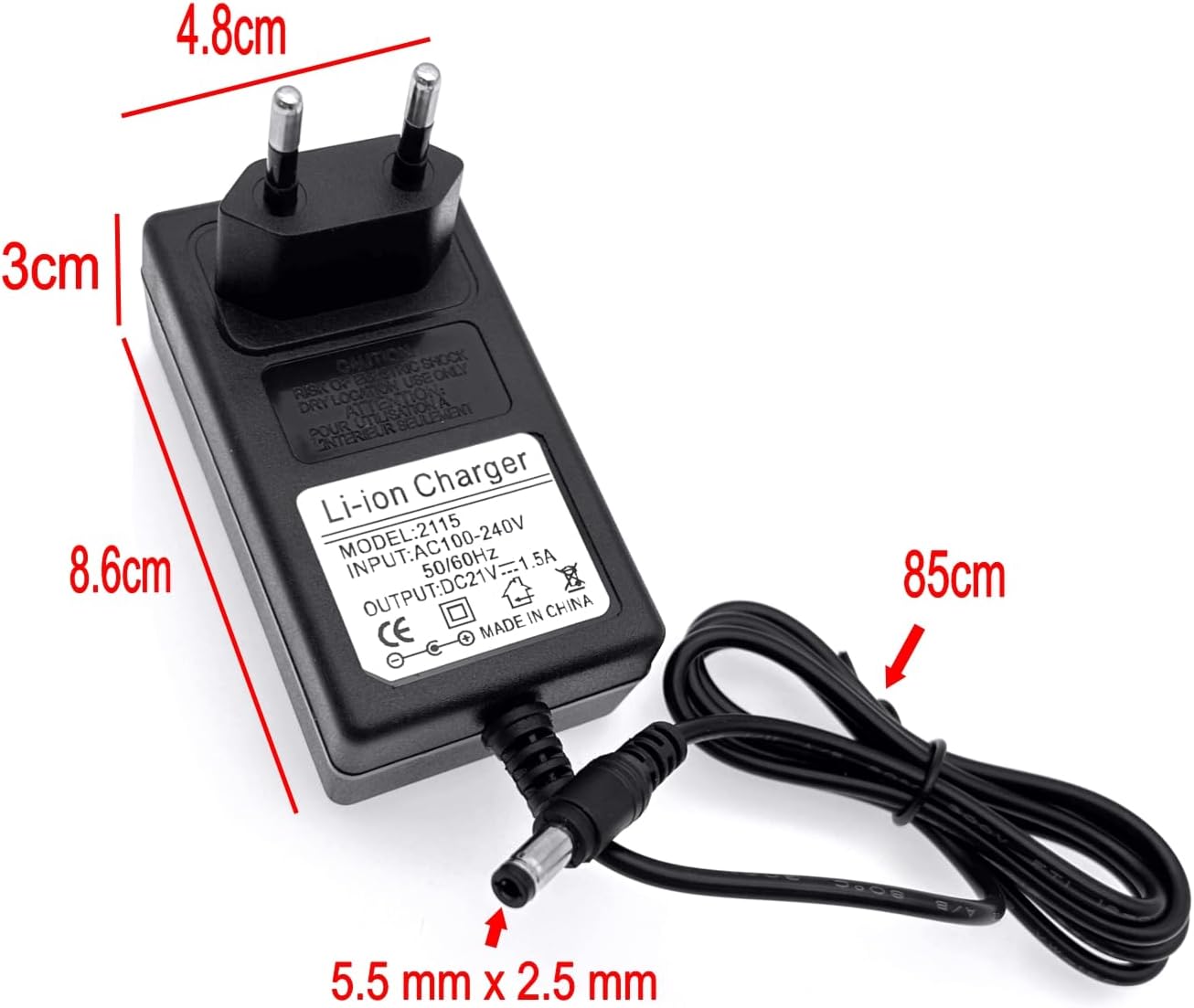 - Eingang: AC 100–240 V, 50/60 Hz Ausgang: DC 21 V, 1.5 A (1500 mA), 31.5 W max. DC Steckergröße: 5.5 mm x 2.5 mm. Netzadapter Kabellänge: 85 cm.