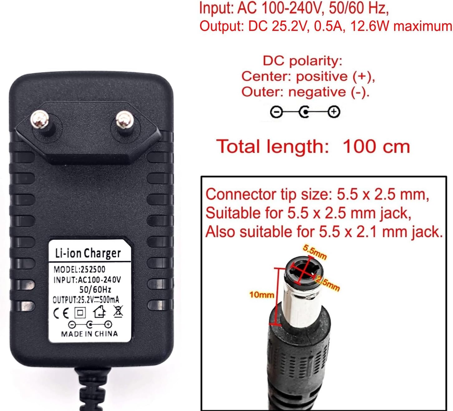 Das JZK AC/DC-Netzteil liefert eine Ausgangsspannung von 25,2 V bei einer Stromstärke von 500 mA. Es ist als zuverlässiges Backup- oder Ersatzladegerät für kompatible Li-Ionen-Akkus konzipiert.