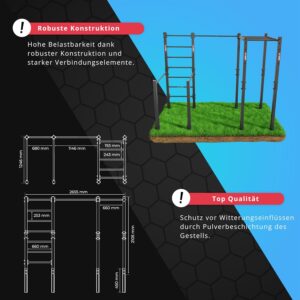 Dieses System ist als festinstallierte Trainingsstation im privaten Garten konzipiert. Nutzer sollten bei der Montage darauf achten, einen ebenen Untergrund zu wählen und genügend Freiraum um das Gerät herum einzuplanen, um die Hangelleiter voll ausnutzen zu können. Ob du ambitionierter Calisthenics-Sportler bist oder einfach eine effiziente Möglichkeit für den Feierabend-Sport unter freiem Himmel suchst – das Gerät hält auch intensiver Frequenz stand.