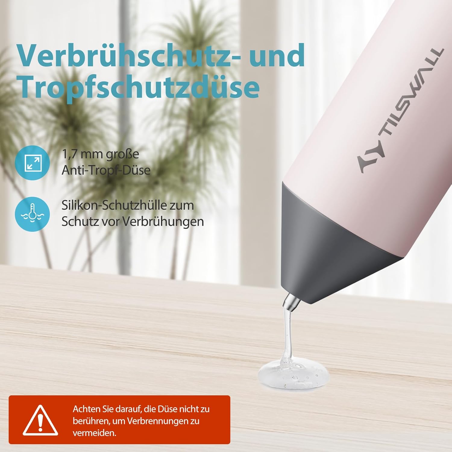 Die Tilswall Heißklebepistole verfügt über eine spezielle 1.7mm Anti-Tropf-Düse, die Nachtropfen verhindert. Dies sorgt für sauberes, präzises Arbeiten ohne störende Klebereste, besonders bei feinen Bastelarbeiten.
