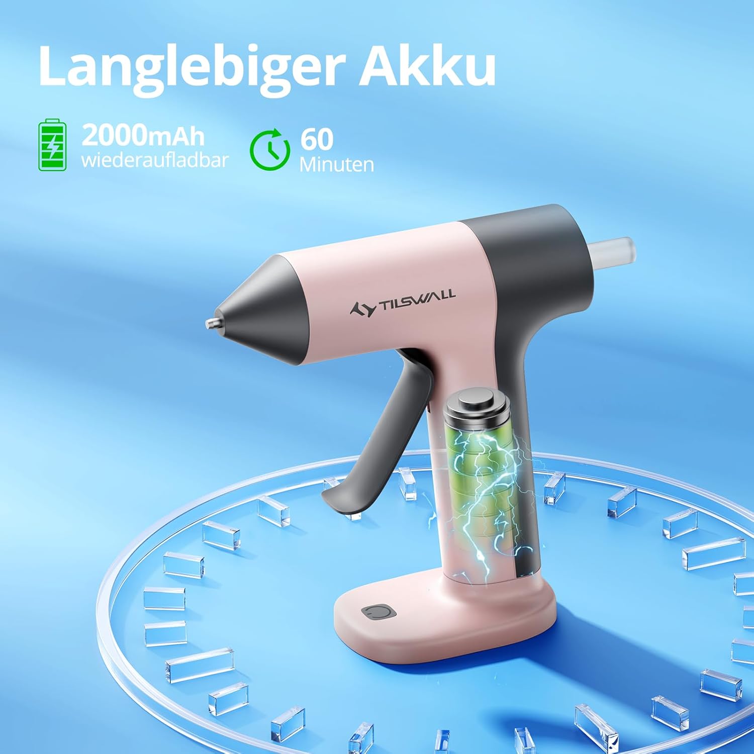 Die Tilswall Akku-Heißklebepistole erreicht ihre Betriebstemperatur in nur 30 Sekunden. Dies ermöglicht schnelles, effizientes Arbeiten ohne lange Wartezeiten, ideal für spontane Bastel- und Reparaturarbeiten.