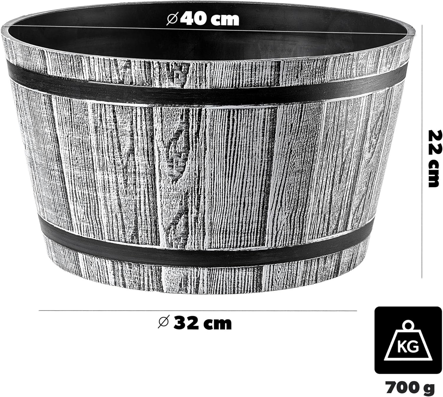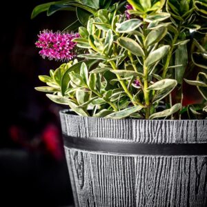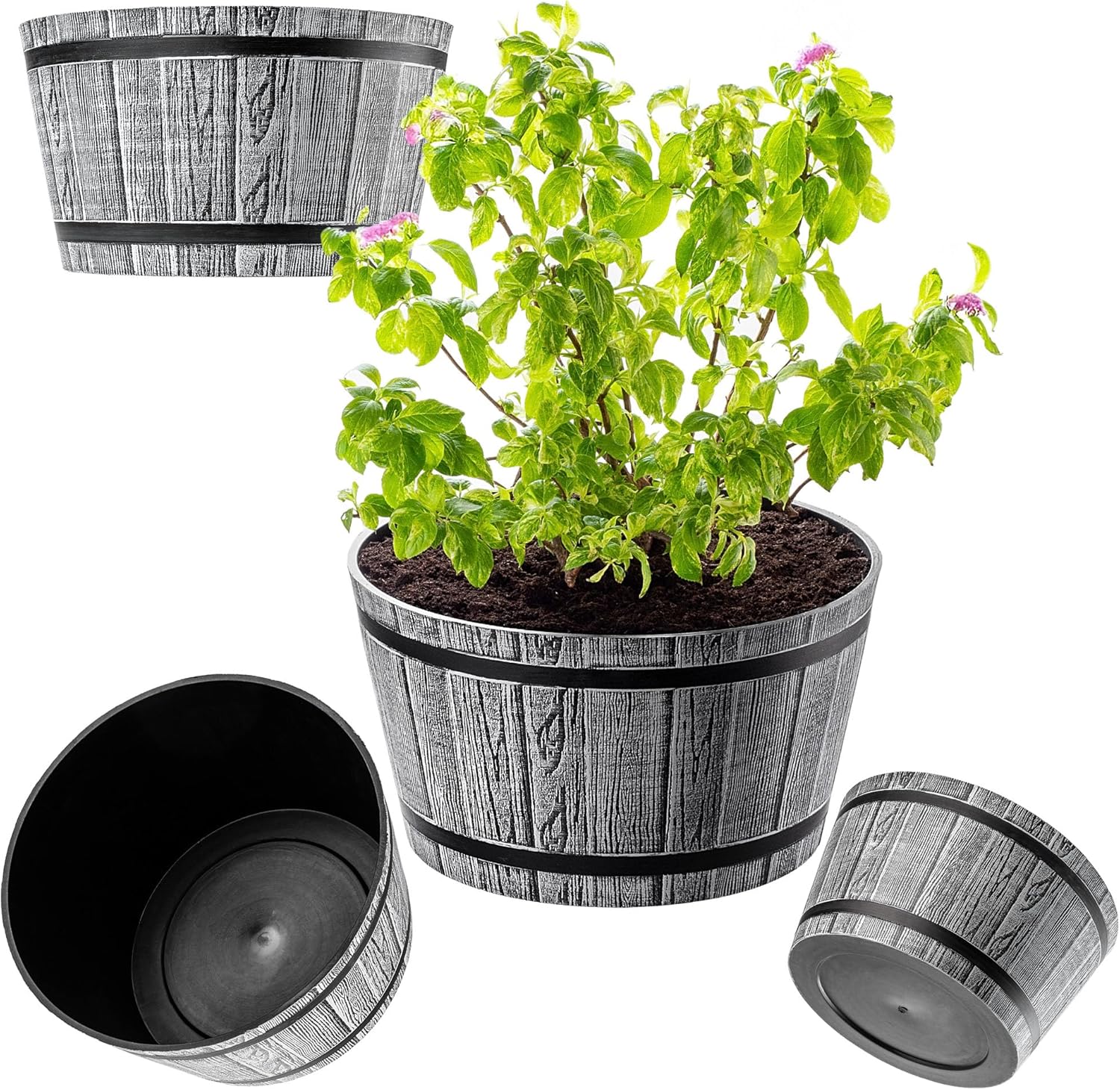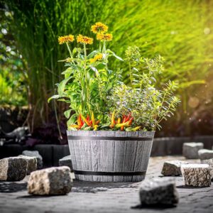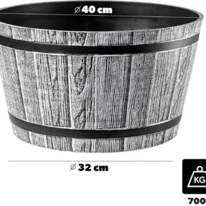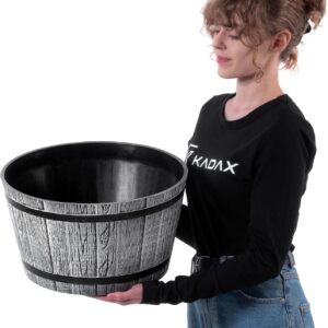 KADAX Pflanztopf im Holzfass-Design, ø 40 cm, aus wetterfestem Kunststoff, für Garten, Terrasse & Balkon, dekorativer Blumentopf, Blumenkübel oder Übertopf, Hellgrau, Teich mit Wassereimer –