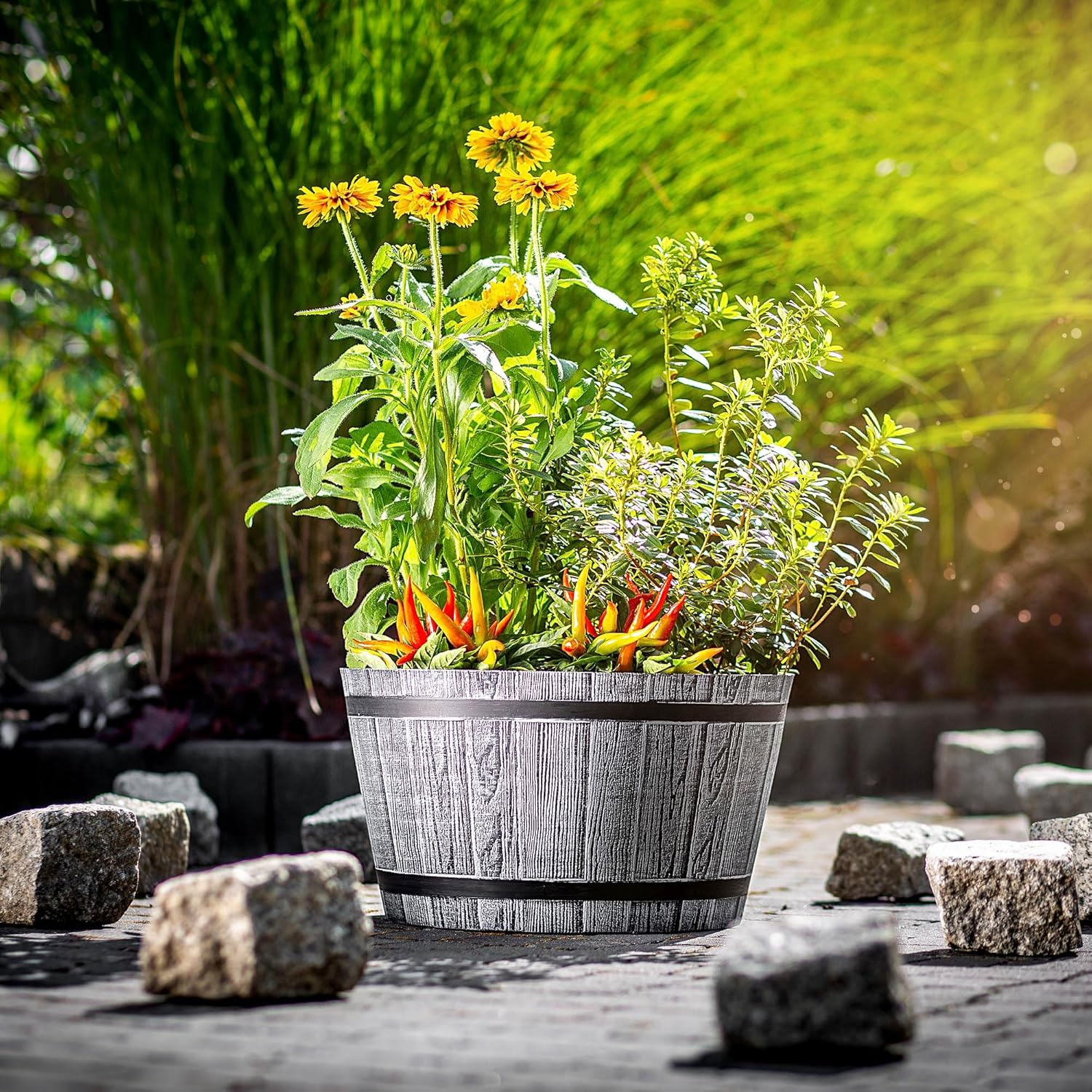 - 🌻 DAS ELEGANTE BLUMENGEFÄSS EIGNET SICH IDEAL NICHT NUR FÜR DIE TERRASSE, sondern auch für die mit Pflaster oder Kieselsteinen bedeckten Bereiche im Garten. Durch das frostfeste Material, aus dem es besteht, werden Pflanzen fast ganzjährig zu einem attraktiven Blickfang neben dem Haus oder zu einer schönen Dekoration auf der Terrasse. Den Topf kann man auch im Freien benutzen.