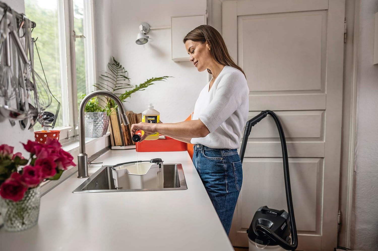 - Anwendung: Gerät laut Herstelleranleitung befüllen; den Reiniger gleichmäßig auf die Fläche sprühen und direkt wieder absaugen.
