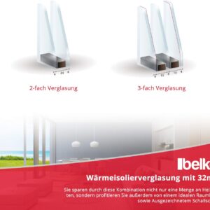 Die 2-fach-Wärmeverglasung besteht aus einem 32 mm starken Aufbau (4/24/4), der mit dem Edelgas Argon gefüllt ist. Diese hochwertige Isolierverglasung sorgt für eine verbesserte Wärmedämmung und bietet zudem eine Schalldämmung von bis zu 46 dB.