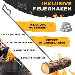 • Sofort einsatzbereit: Komplettset mit Grillrost Ø52cm, 60cm Gusseisen-Feuerhaken, Funkenschutz, Grillbürste und wetterfester Abdeckhaube – kein Nachkaufen nötig