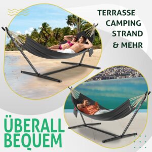 Ja, die Hängematte ist als Doppel-Hängematte konzipiert und bietet ausreichend Platz für zwei Personen. Dank der hochbelastbaren Konstruktion ist sie mit einem Gesamtgewicht von bis zu 200 kg belastbar, sodass Sie entspannte Stunden gemeinsam genießen können.
