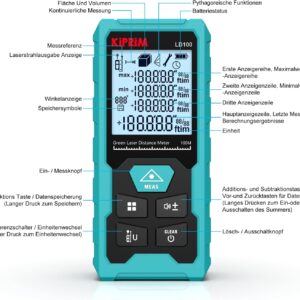 Der Kiprim Laser-Entfernungsmesser LD100 überzeugt durch sein funktionales Design, das auf maximale Effizienz ausgelegt ist. Die Bedienung ist intuitiv gestaltet, sodass auch bei komplexen Berechnungen wie der Flächen- oder Volumenermittlung keine lange Einarbeitungszeit notwendig ist. Die kompakte Gehäuseform liegt ergonomisch in der Hand und passt in jede Werkzeugtasche.