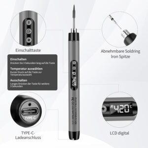 KKMOL Akku Lötkolben Set, USB Wiederaufladbar Lötkolben mit LCD, Temperatur Einstellbare 330 ℃-420 ℃, 3 Lötspitzen, Lötdraht, Lötpaste, Professionelles Sicheres Komplettes Lötkolben-grauKKMOL Akku Lötkolben Set, USB Wiederaufladbar Lötkolben mit LCD, Temperatur Einstellbare 330 ℃-420 ℃, 3 Lötspitzen, Lötdraht, Lötpaste, Professionelles Sicheres Komplettes Lötkolben-grau