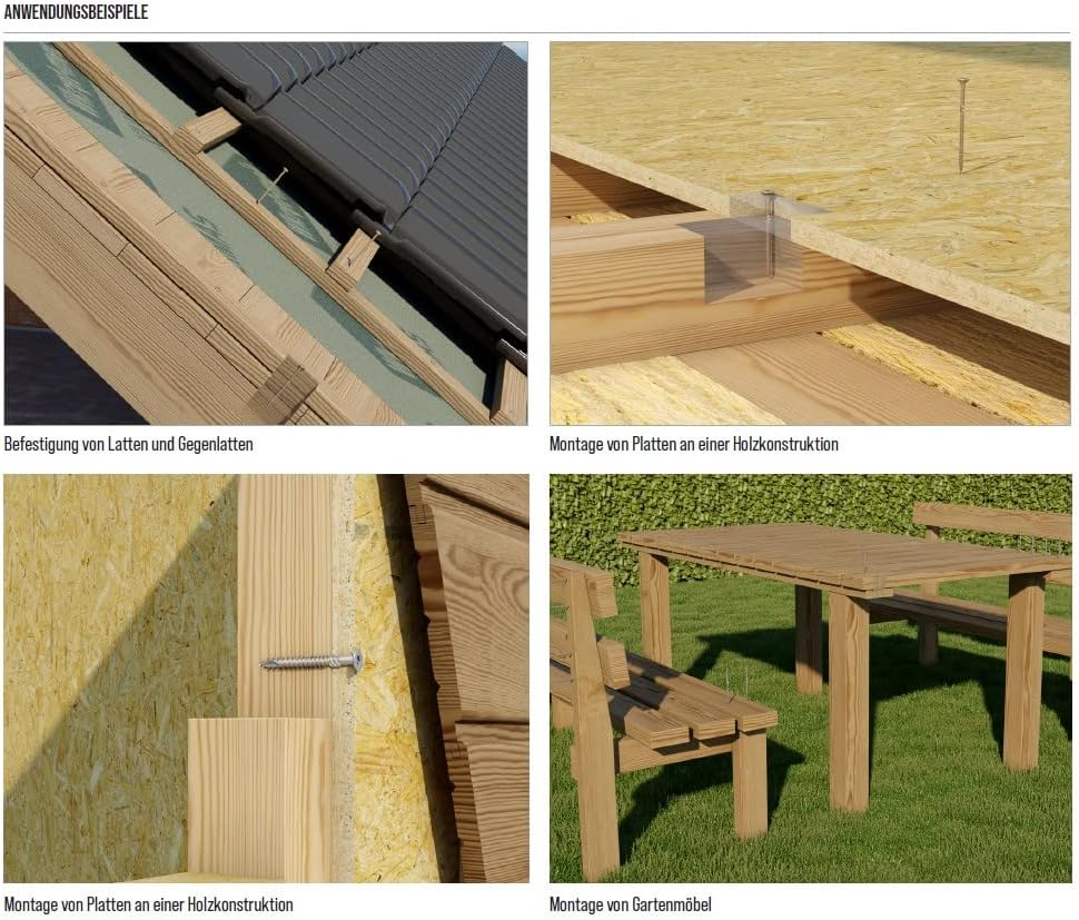Zielgruppen: Zimmerer und Holzbauer schätzen die Zeitersparnis bei größeren Projekten. Dachdecker nutzen sie für Konstruktionsarbeiten. Terrassen- und Gartenbauer profitieren vom großen Vorrat im Set. Aber auch versierte Heimwerker, die ihr Gartenhaus selbst bauen oder die Terrasse erneuern, kommen mit diesen Schrauben gut zurecht – der Torx-Antrieb verzeiht auch weniger geübte Handhabung.