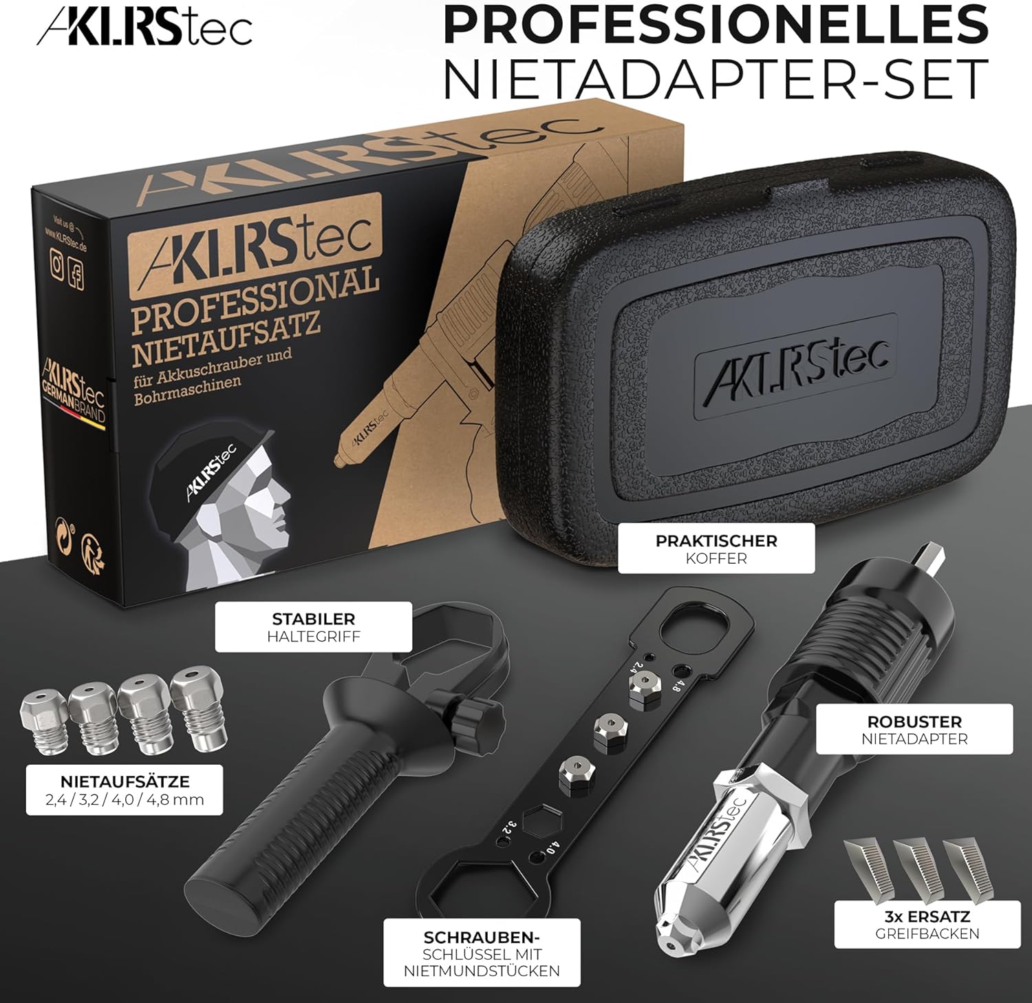 Der KLRStec Professional Nietadapter ist darauf ausgelegt, handelsübliche Akkuschrauber und Bohrmaschinen in eine Nietzange zu verwandeln. Achten Sie bei der Nutzung stets auf einen sicheren Sitz des Adapters im Bohrfutter, um das volle Potenzial der starken Nietfunktion optimal zu nutzen.