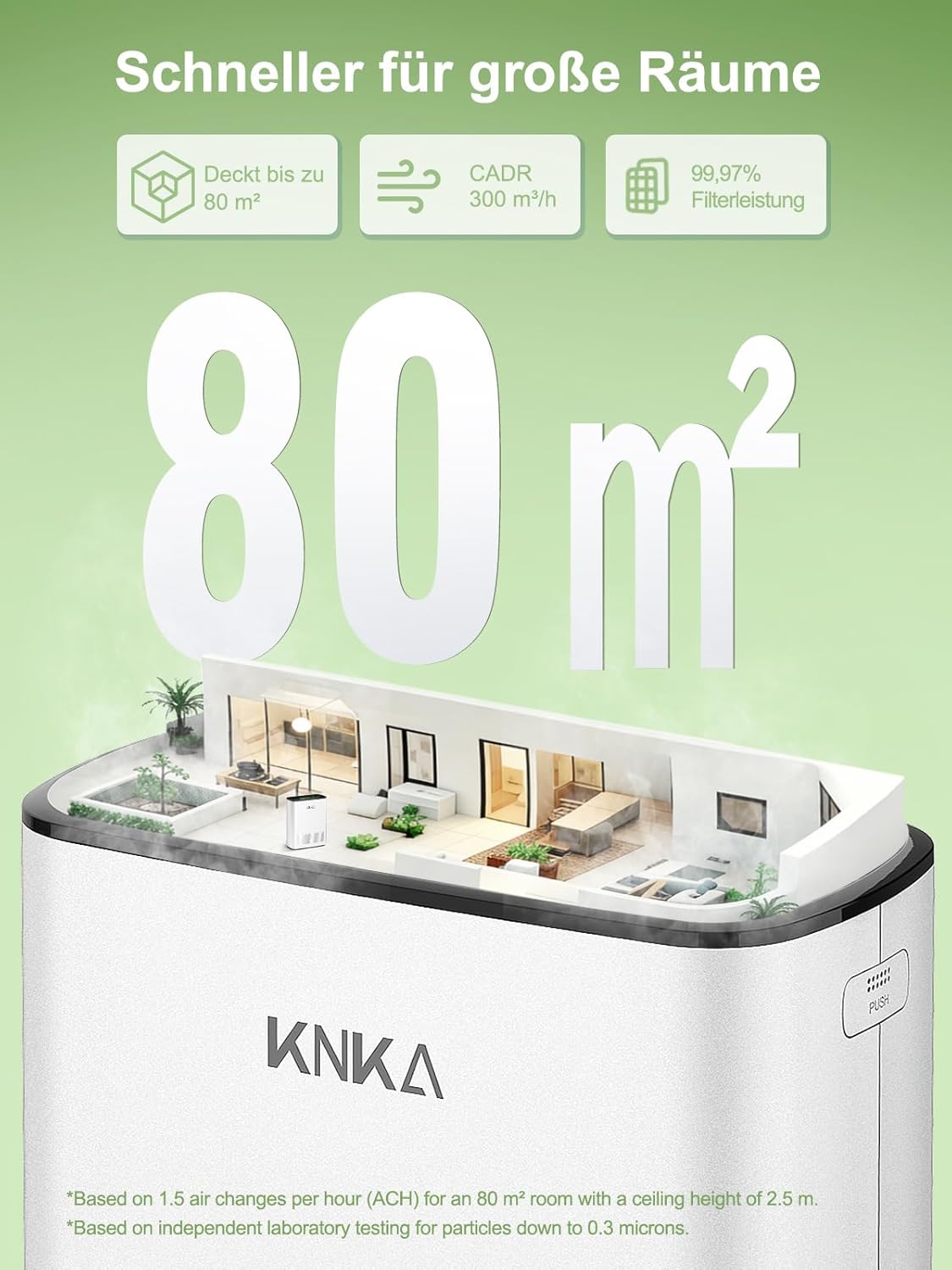Der KNKA APH3000 bietet eine hohe Reinigungsleistung und ist für Raumgrößen von bis zu 80 m² konzipiert. Die Berechnung der Raumgröße basiert dabei auf 1,5 Luftwechseln pro Stunde bei einer Standard-Raumhöhe von 2,5 Metern.
