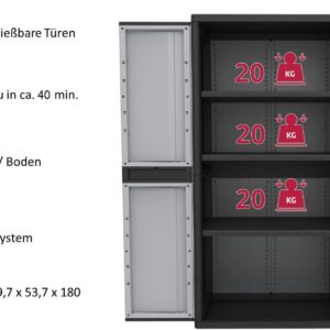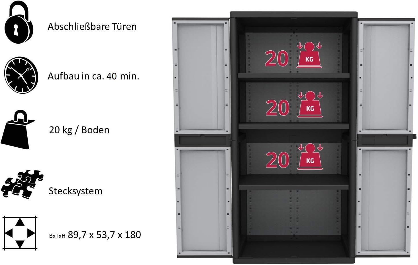 83 Rezensionen für Kreher XXL Kunststoffschrank mit 3 höhenverstellbaren Böden und abschließbaren Türen. Maße BxTxH in cm: 89,7 x 53,7 x 180 cm