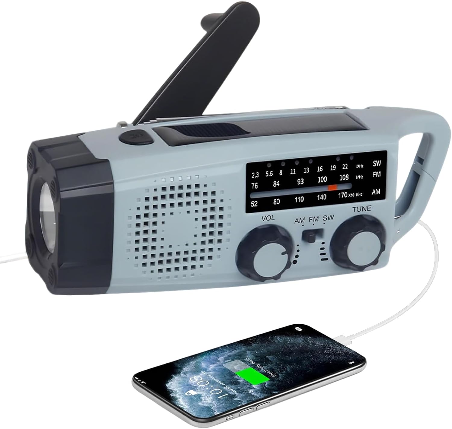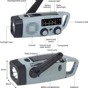 - NOTFALLRADIO UND SOS ALARM: Kurbelradio die eingebaute, superhelle 1-W-Taschenlampe und das Leselicht sind bei einem Stromausfall unerlässlich.kurbel powerbank es verfügt außerdem über einen USB-Anschluss zum Aufladen Ihrer USB-fähigen Smart-Geräte für die Kommunikation. Drücken Sie einfach die SOS-Taste, um einen akustischen Alarm und ein auffälliges Blinklicht auszulösen und um Hilfe zu rufen.