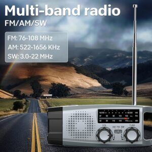 - AM/FM/SW Solar Radio: Das tragbare Notfallradio unterstützt die AM/AFM/SW-Bänder. Sie können zwischen AM, FM und SW wechseln, um schnell die tägliche Vorhersage zu erhalten. FM/AM-Radio bietet guten Empfang auch bei ausgeschalteter Antenne (AM520-1710 kHz, FM87-108 MHz, SW7-19 MHz) sowie Kurzwellensender.