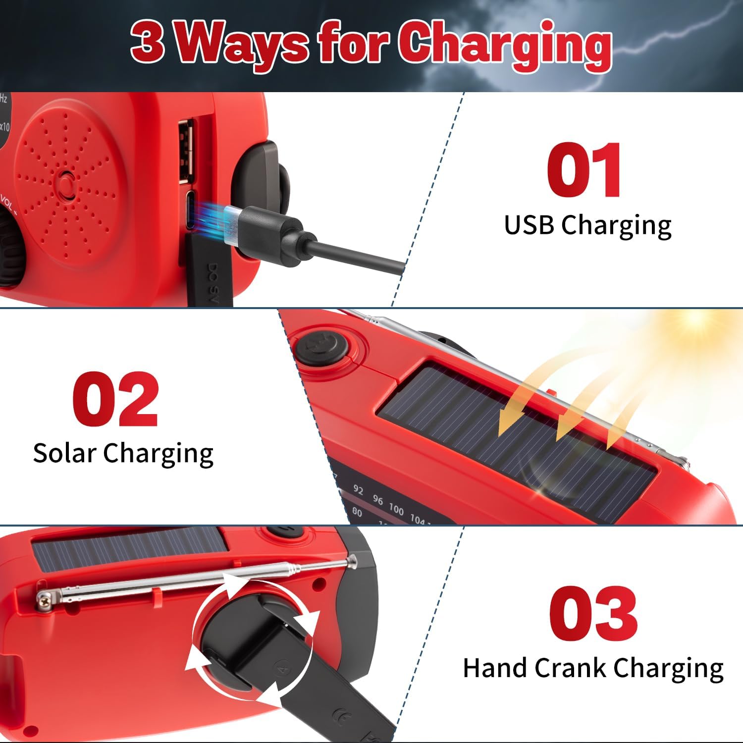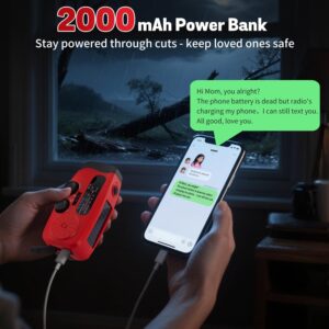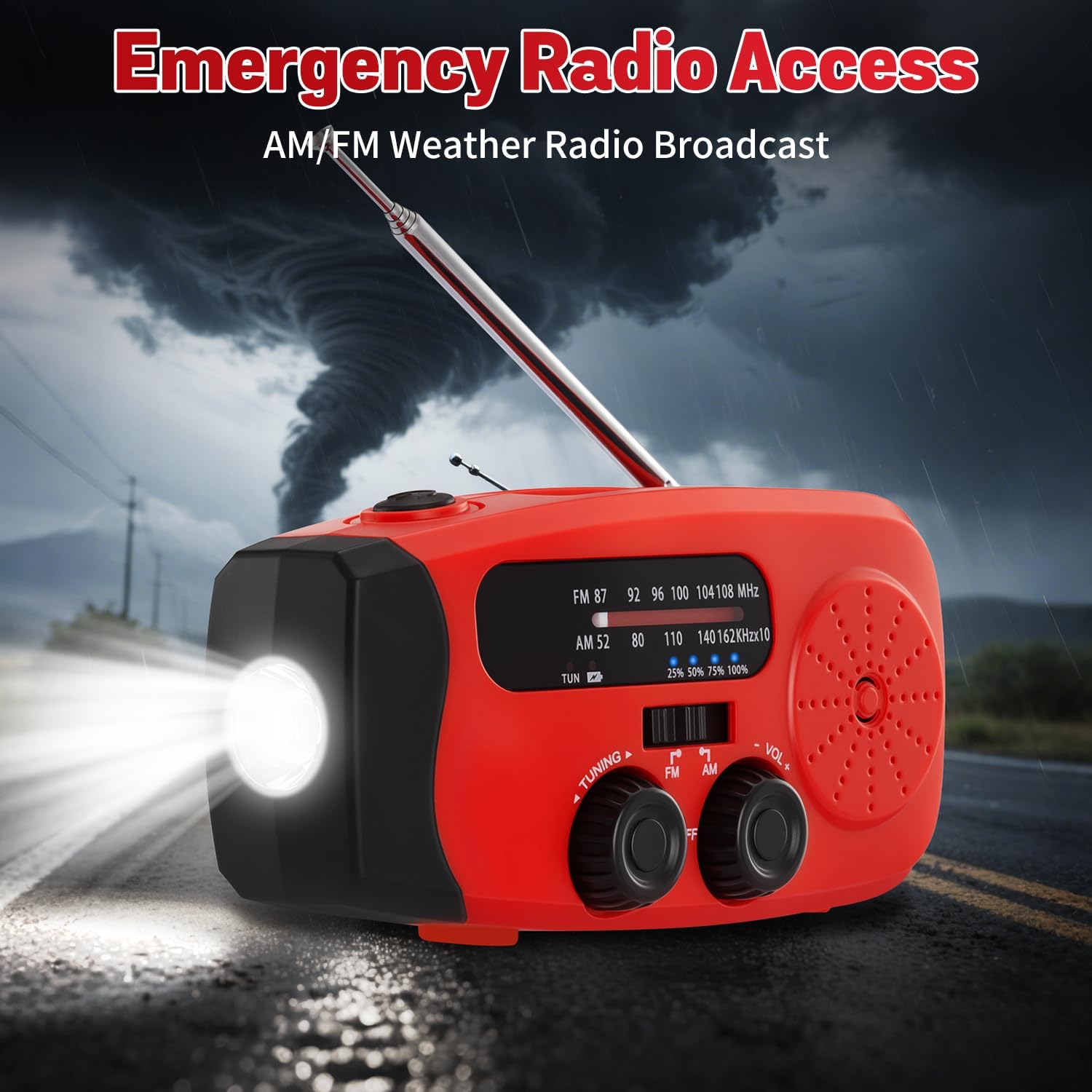 - 【Dreifache Stromversorgung】Unterstützt USB-C Schnellladung, Handkurbel-Betrieb und Solarladung. Ein 2000mAh Akku ermöglicht 14 Stunden Beleuchtung oder 7 Stunden Radiobetrieb bei voller Ladung und kann auch als Notstromquelle für Handys dienen. Die kurbel- und solarbetriebene Energiegewinnung gewährleistet Kommunikation bei Stromausfall, Netzwerkunterbrechungen, Outdoor-Abenteuern und Rettungseinsätzen.