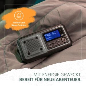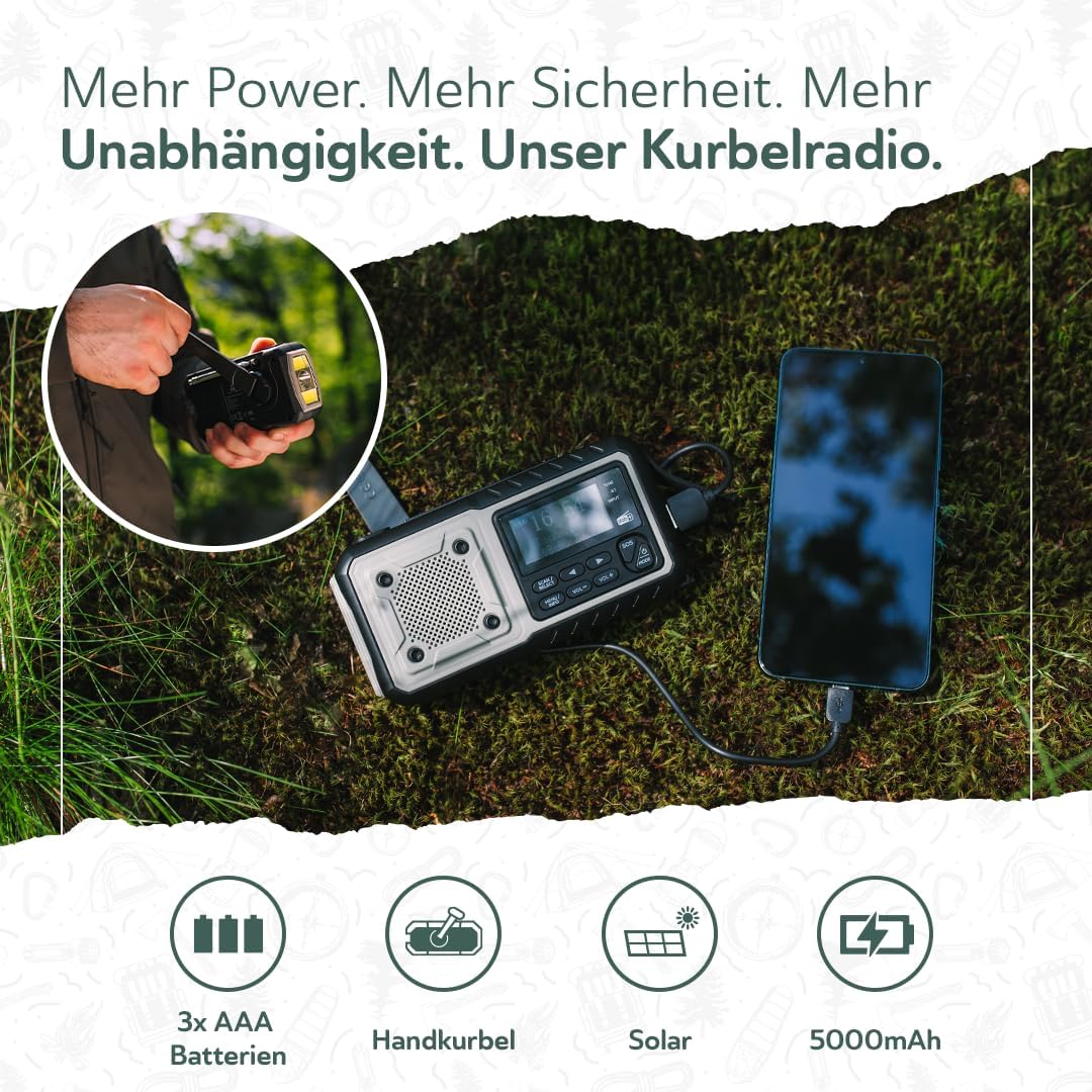 - Unabhängiges Energiemanagement: Dank 5000 mAh Akku, Solarmodul und Handkurbel bist du nie auf eine Steckdose angewiesen.