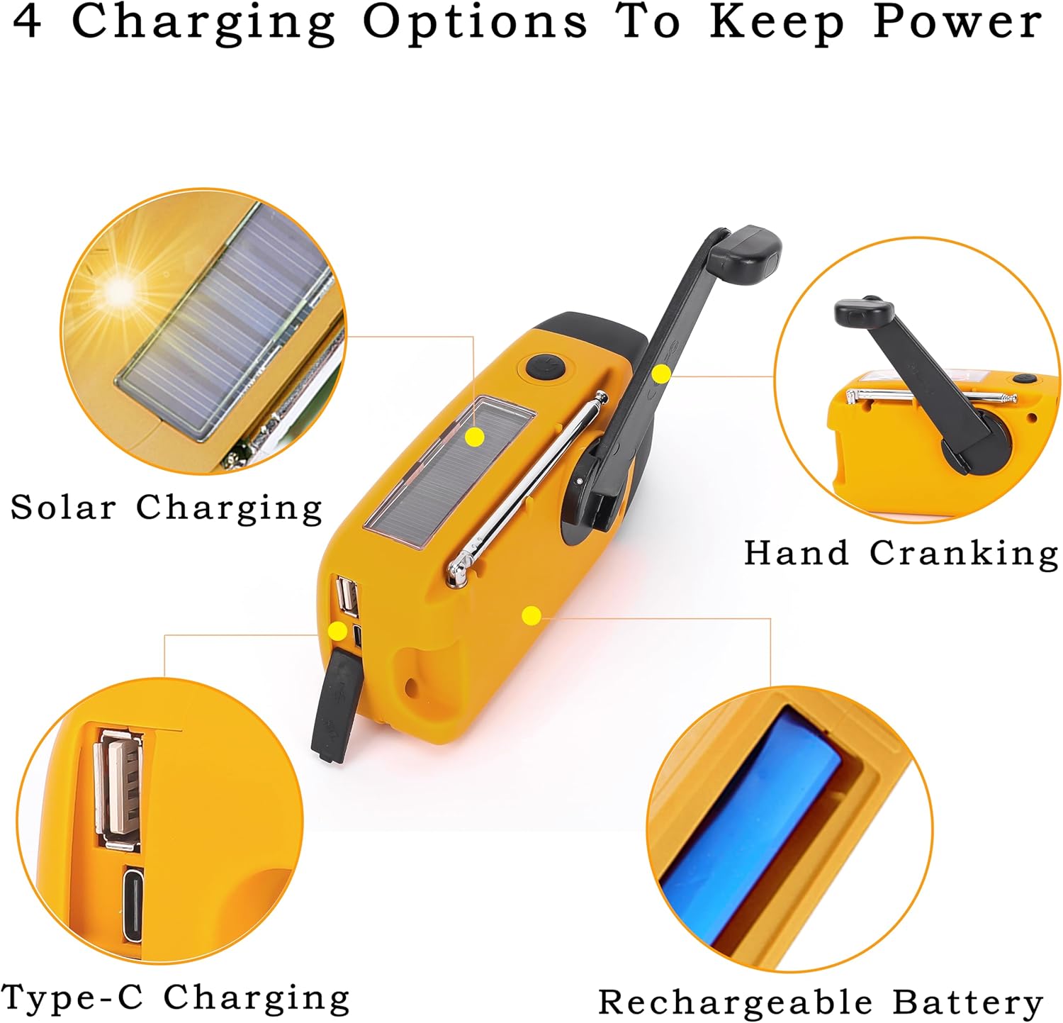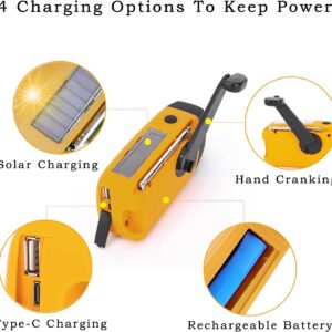 - . [ 4 Rechargeable Ways ] Hand crank dynamo radio, solar powered radio,5V Type-C charging input, and built-in 2000mAh battery powered Wind Up Solar radio can provide 14 hours of light or 5-7 hours of radio time, also providing emergency power bank for iPhone & cellphone & iPad as a power cut survival kit.