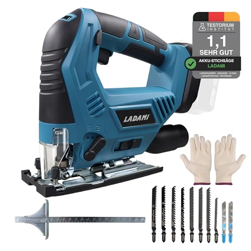 LADAMI Akku-Stichsäge Kompatibel mit Makita 18V Akkus,Akku-Pendelhubstichsäge mit 12 Stichsägeblatt,7 Geschwindigkeiten,max. 45° Schrägschnitte 4-Stufen Pendelhub Stichsägen für Holz,PVC und Metall