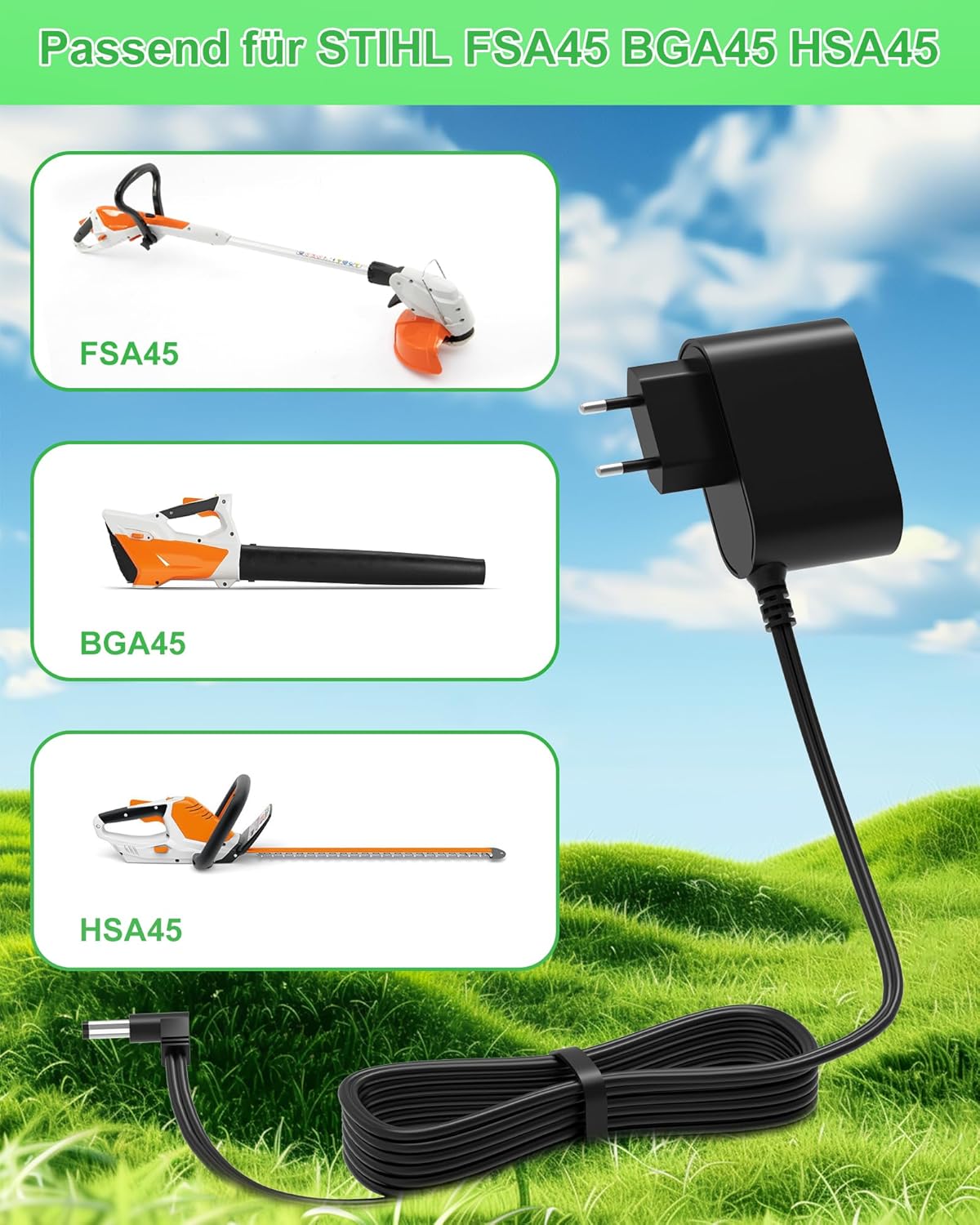 Dieses Netzteil ist speziell für die STIHL-Modelle FSA45, BGA45 und HSA45 konzipiert. Es dient als passgenauer Ersatz für die Artikelnummern 45114005602 sowie 45114005603 und bietet eine zuverlässige Stromversorgung.