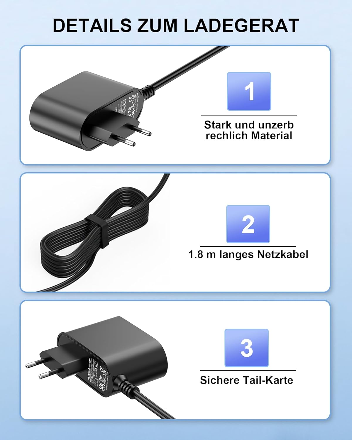 - Stabile Ladeleistung: Mit einer Ausgangsspannung von 22,5 V und 0,65 A wird der interne Akku schonend geladen – genau wie beim Original.