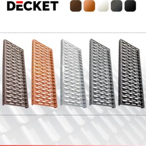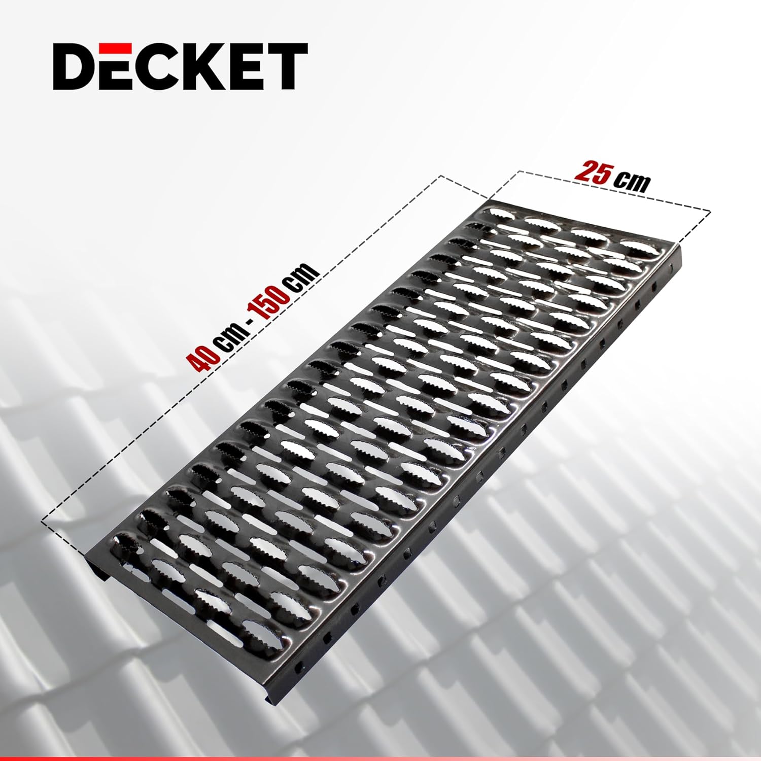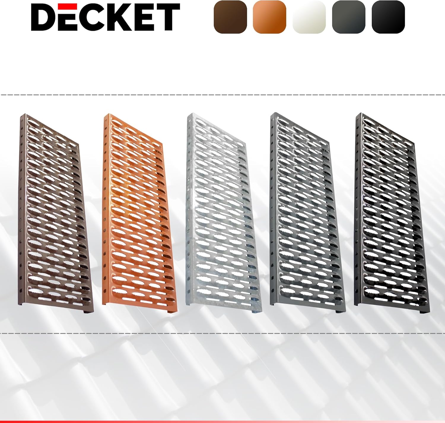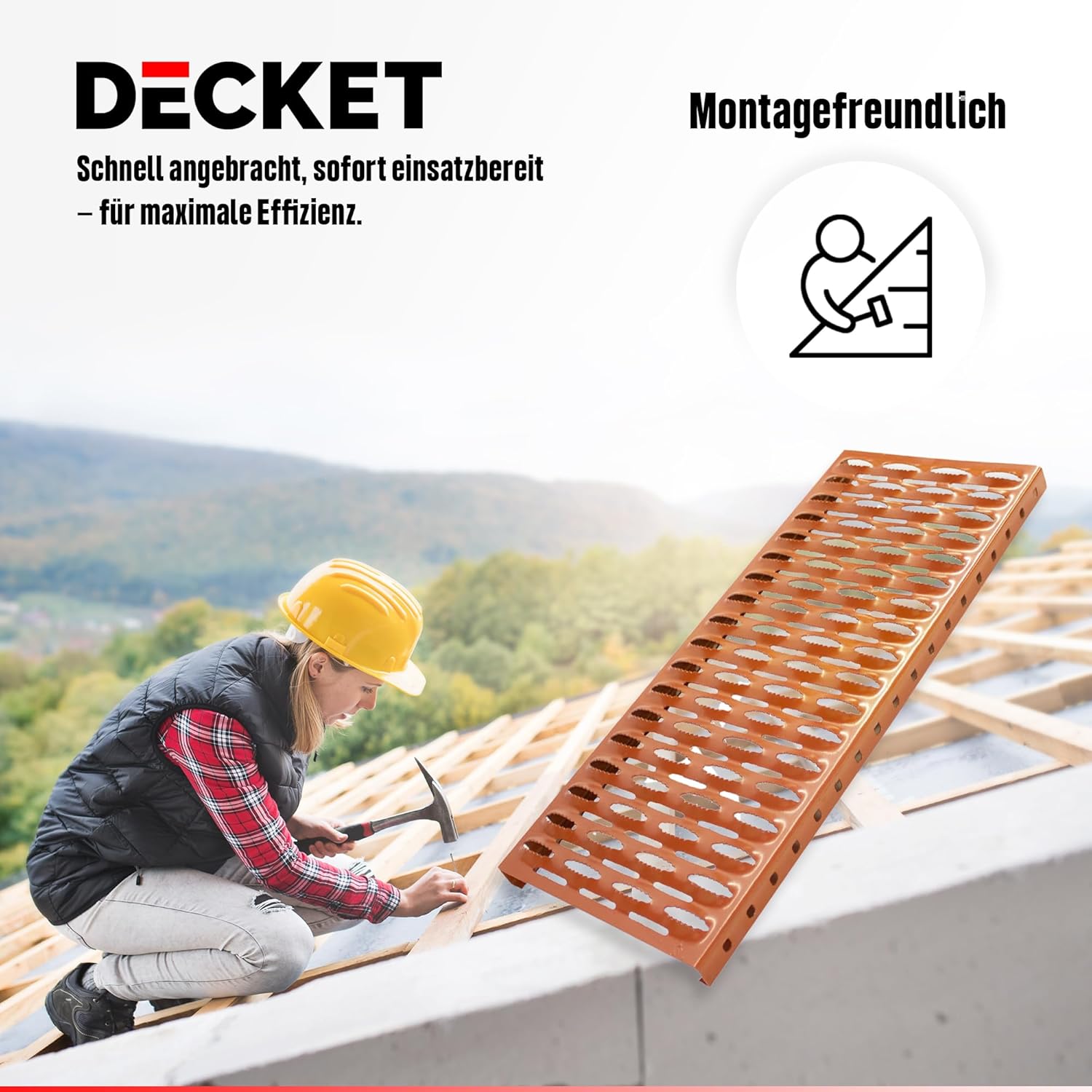Ein komfortabler und sicherer Laufrost sollte idealerweise eine Breite von 250 mm aufweisen, wie sie das Modell von Decket bietet. Diese Breite sorgt in Kombination mit einer Höhe von ca. 40 mm an den Eckpunkten für ausreichend Platz und Trittsicherheit bei verschiedenen Anwendungen – sei es für den Zugang zu Kaminen oder Dachluken. Die kompakte Bauweise ermöglicht zudem eine flexible Nutzung auf nahezu allen Dachtypen.