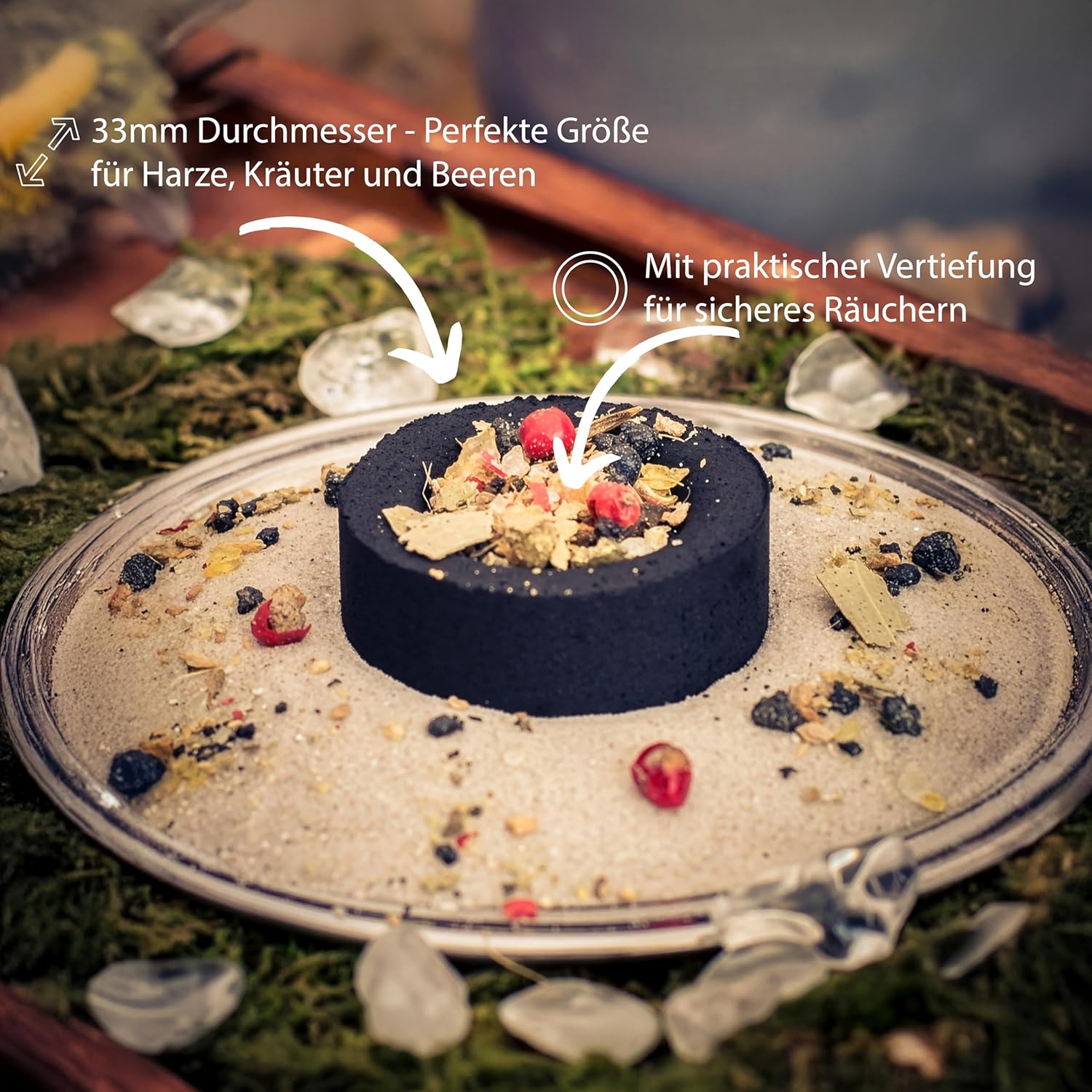 Lebensquelle Plus Räucherkohle Ø 33mm | 10 selbstzündende Kohletabletten | Schnellzünd-Kohle für Harze & Kräuter | Zuverlässige Räucherkohle in stylischer schwarzer Verpackung –