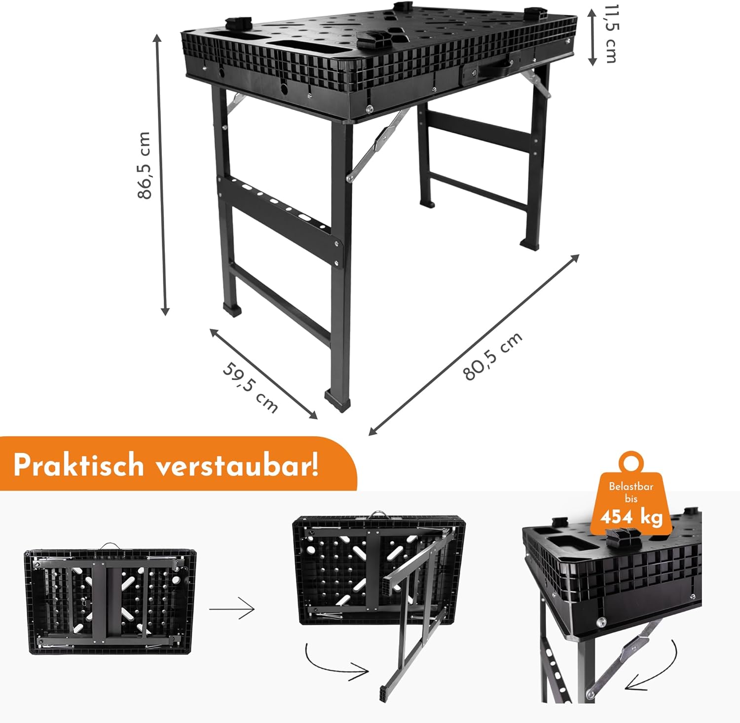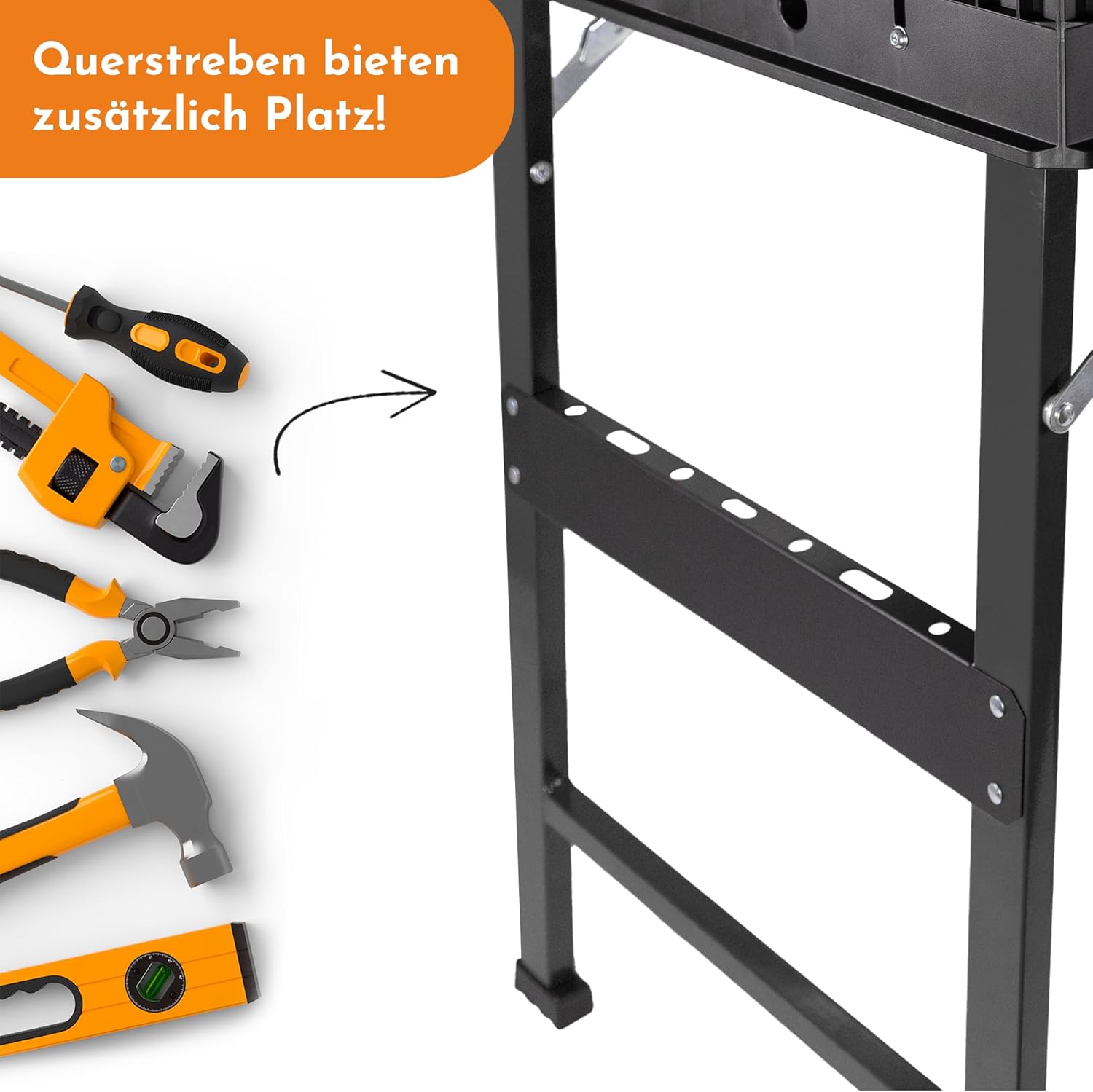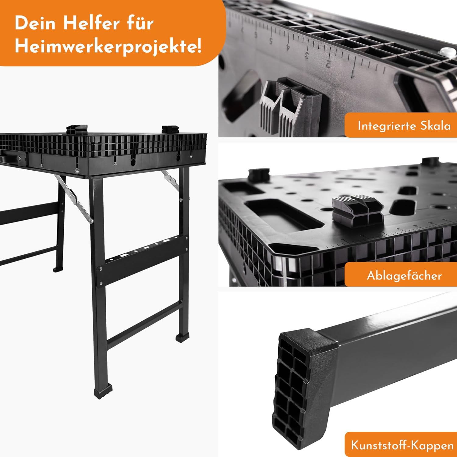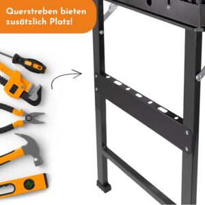 Die robuste Werkbank besteht aus einer Kombination aus stabilen Metallfüßen und einer besonders belastbaren Kunststoff-Tischplatte. Diese Materialwahl sorgt für die nötige Stabilität bei der Arbeit und macht den Tisch gleichzeitig zu einem langlebigen Begleiter in Werkstatt, Garage oder Garten.