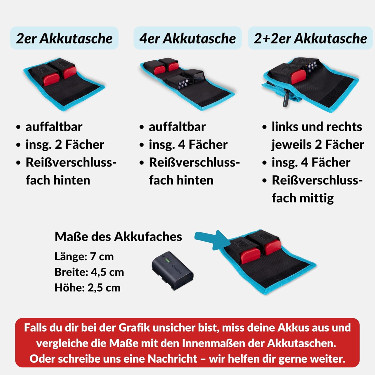 Die Tasche ist vielseitig einsetzbar und mit allen gängigen Kamera-Akkus von Marken wie Canon, Sony, Fuji, GoPro sowie DJI Mini kompatibel. Zudem bietet sie ausreichend Platz für klassische AA- oder AAA-Batterien, sofern diese die maximalen Abmaße von 7 x 4,5 x 2,5 cm nicht überschreiten.