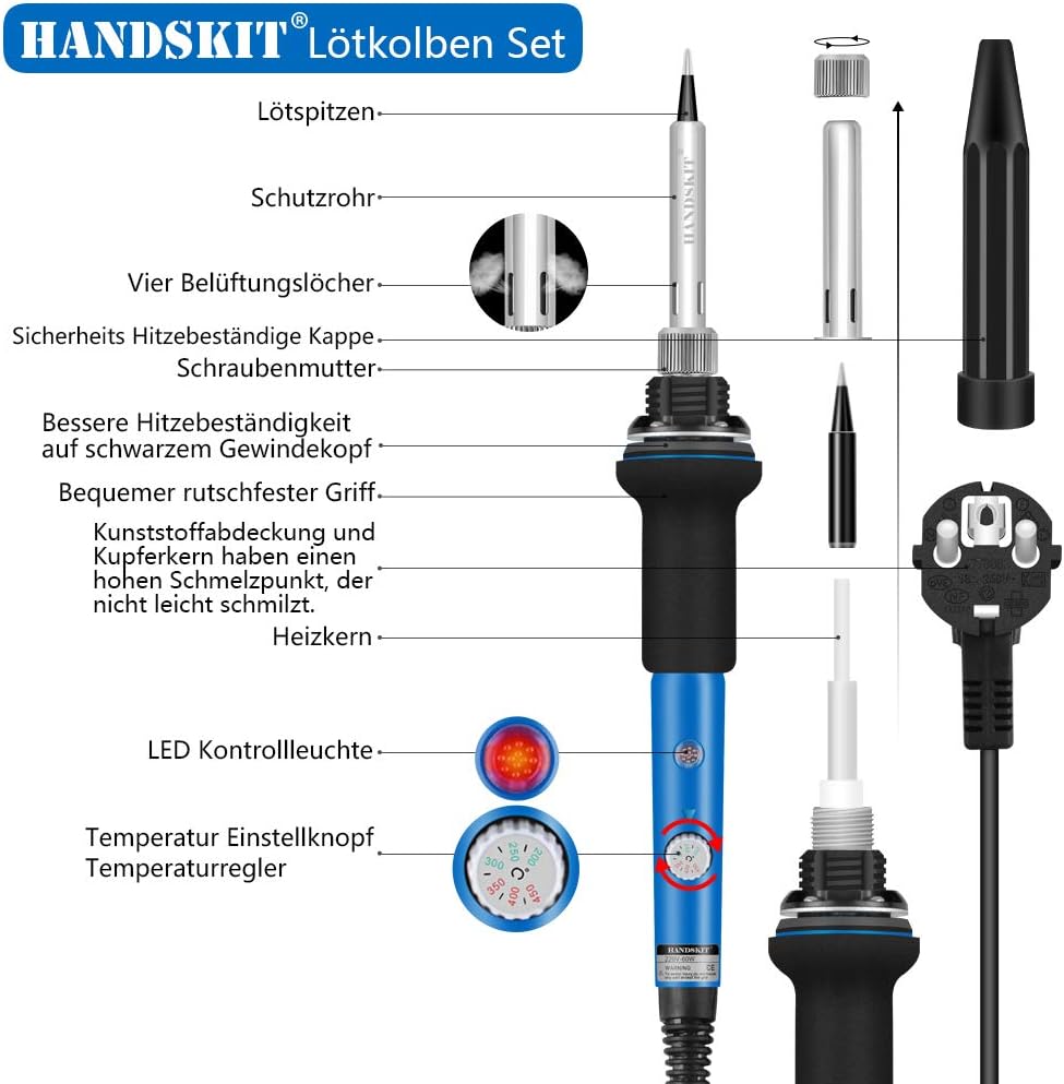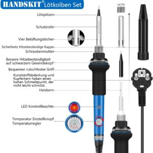 - HANDSKIT 90W einstellbarer Lötkolben mit präziser Temperaturregelung (180°C–480°C/356°F–896°F) und Konstanttemperatur-Design. Die °C/°F-Umschaltung erfolgt durch gleichzeitiges Drücken der „+“- und „–“-Tasten, Einstellungen werden nach 3 Sekunden Inaktivität automatisch gespeichert. LCD zeigt Temperatur in Echtzeit. Effizientes System mit 2 Heizelementen und 2 Sensoren für stabile Leistung. Heizt in 10 Sekunden, Griff bleibt kühl. Ideal für DIY, kleine Bauteile, PCBs, Handys und Haushaltsgeräte.