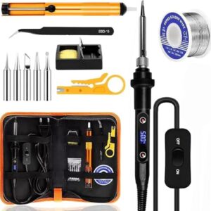 Lötkolben Set,80W LCD Lötkolben mit Einstellbar Temperatur 180-500°C,Ein/Aus Schalter,5 Wechselspitzen zum Löten,Entlötpumpe,Lötkolbenständer, Pinzette, Lötset für Elektrische Arbeiten