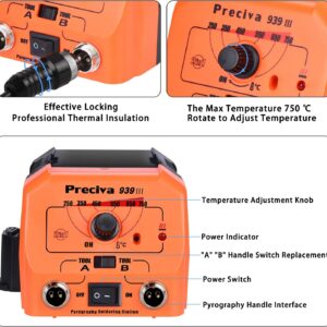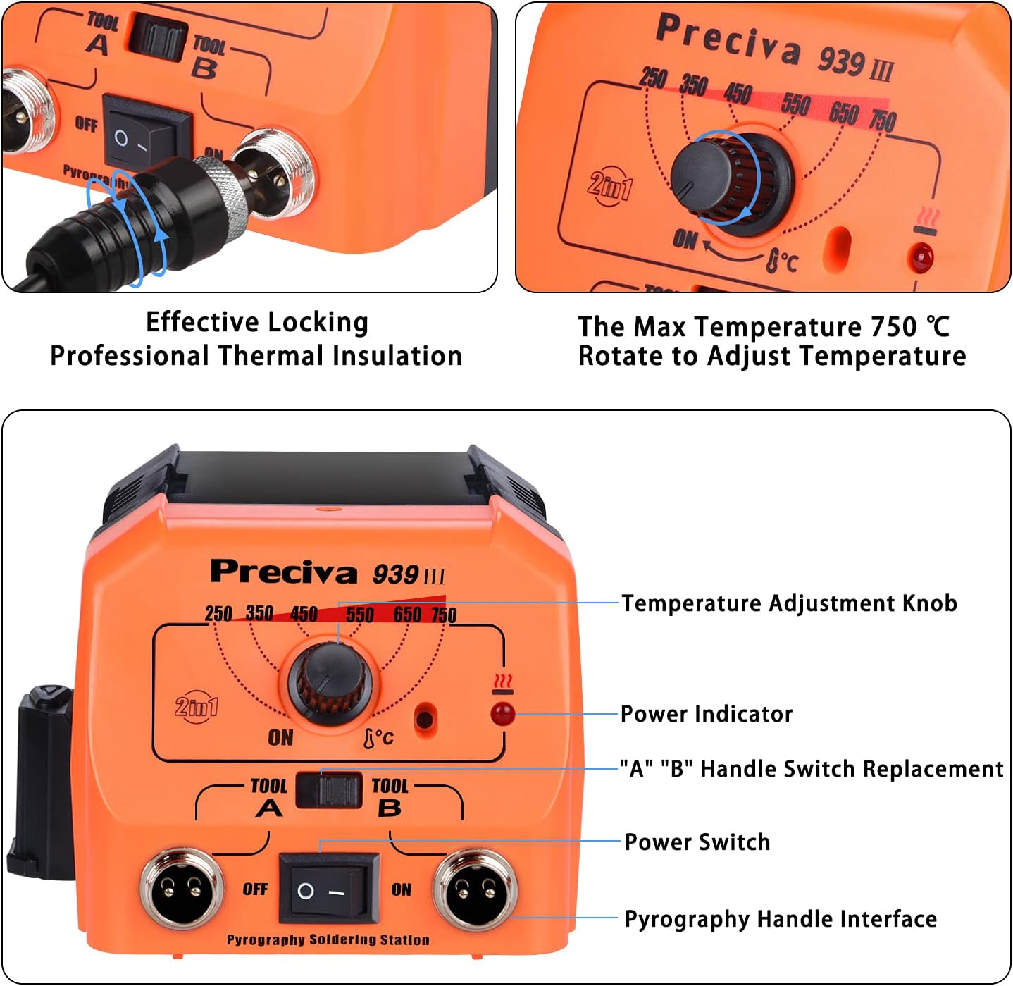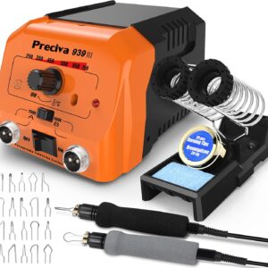 - 【40W Lötstation mit Transformator, schnelles Aufheizen】 Preciva bietet eine Lötstation mit 40W Transformator. Die Brandmalstation kann innerhalb von 10 Sekunden Betriebstemperatur erreichen und sofort in Betrieb genommen werden. Und sorgen für konstante Wärme, um die Verbrennungsarbeit gleichmäßig zu erledigen. Die Abkühlgeschwindigkeit des Lötkolbens ist auch schnell nach dem Ausschalten, was den Austausch der Lötspitze vereinfacht.