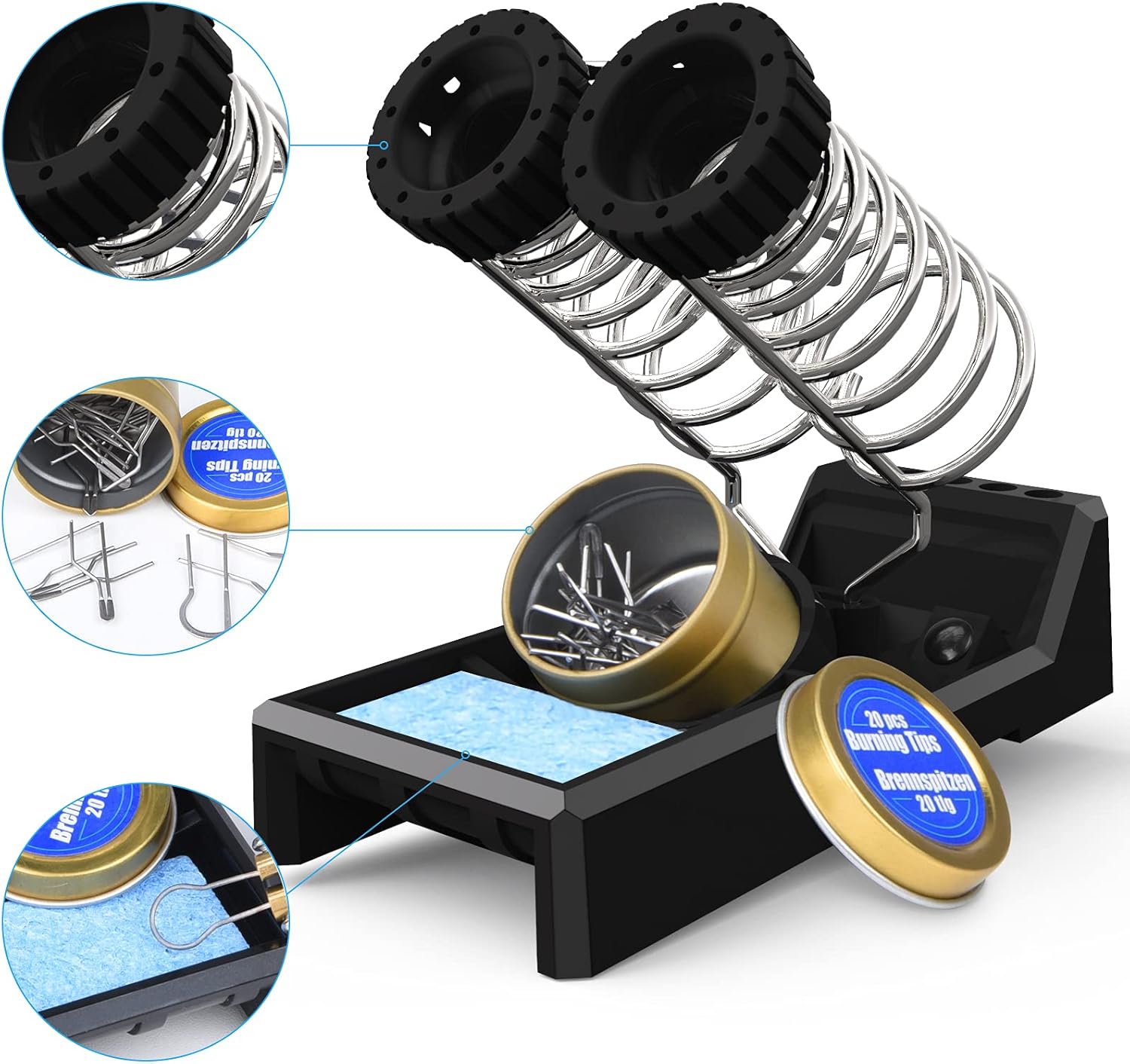 - 【Mehrzweck Lötkolbenständer】Das einzigartige und multifunktionale Design kann auf der Oberseite der Brandmalstation installiert werden, um Platz auf Ihrem Schreibtisch zu sparen. Das hochwertige Bakelit-Material dem Lötkolbenständer hat der Vorteil, hohen Temperaturen standzuhalten und bietet sicheren Schutz für die Platzierung des Lötgriffs nach dem Gebrauch.